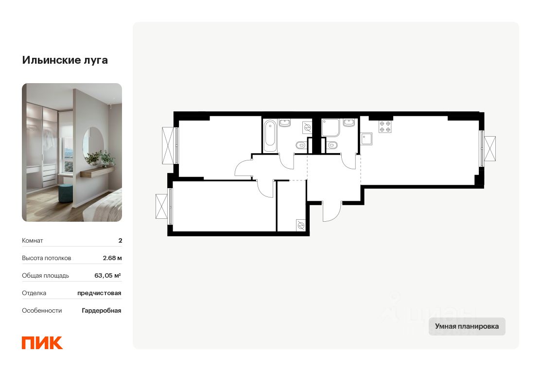 Продаётся 2-комн. квартира площадью 63,05 кв.м на 7 этаже 9 этажного дома (Корпус 3.2, Секция 2) проекта ПИК Ильинские луга. Светлый просторный подъезд на уровне земли, функциональная планировка, большие окна, .