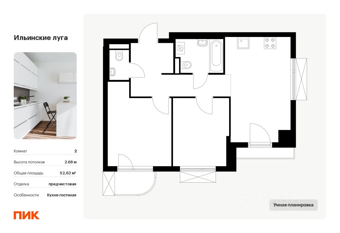 Продаётся 2-комн. квартира площадью 52,62 кв.м на 2 этаже 9 этажного дома (Корпус 3.2, Секция 1) проекта ПИК Ильинские луга. Светлый просторный подъезд на уровне земли, функциональная планировка, большие окна, .