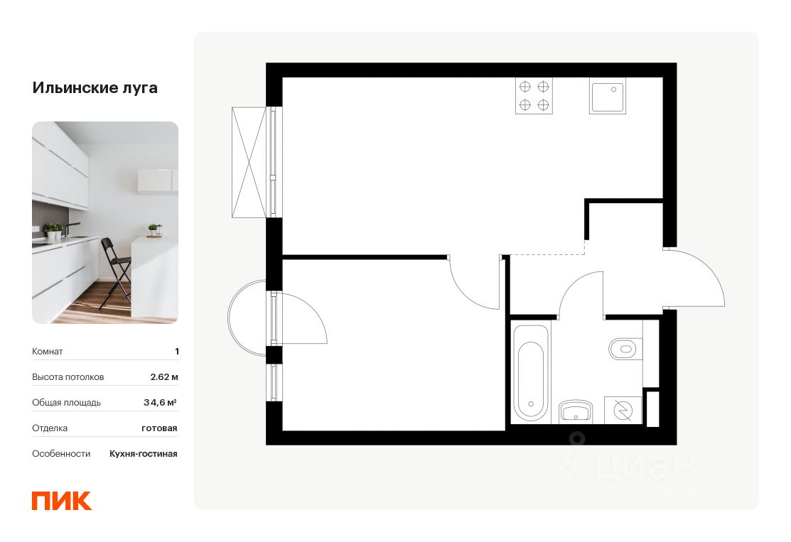Продаётся 1-комн. квартира площадью 34,6 кв.м на 7 этаже 9 этажного дома (Корпус 3.6, Секция 5) проекта ПИК Ильинские луга. Светлый просторный подъезд на уровне земли, функциональная планировка, большие окна, .