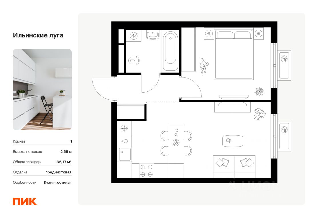 Продаётся 1-комн. квартира площадью 36,17 кв.м на 6 этаже 9 этажного дома (Корпус 3.2, Секция 1) проекта ПИК Ильинские луга. Светлый просторный подъезд на уровне земли, функциональная планировка, большие окна, .