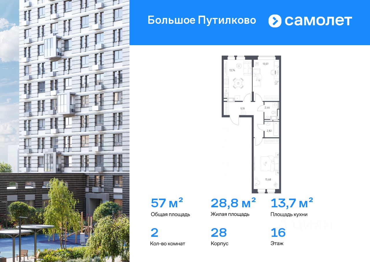 Предлагается 2-комнатная квартира комфорт-класса 56,96 кв.м в корпусе 28 на 16 этаже, в ЖК ''Большое Путилково'' Квартира с чистовой отделкой. Доступность дополнительных опций уточняйте у застройщика.