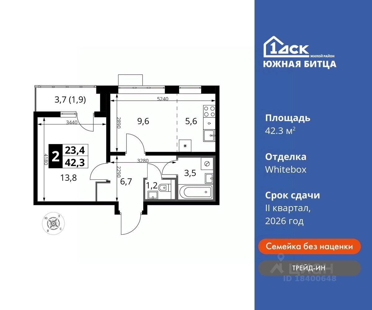 Максимальные скидки при 100% оплате. Ипотека для всех! Своя квартира от 60 600 руб/мес Прямая продажа от застройщика! Семейный жилой район класса Комфорт Плюс Продаётся 2-к квартира номер 200 общей площадью 42.3 кв.м на 11-м этаже 22 этажного дома. Отделка Whitebox.