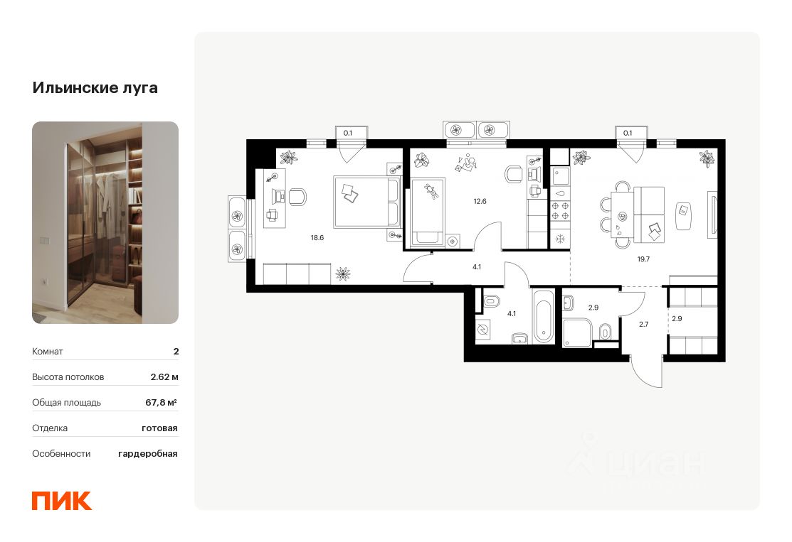 Продаётся 2-комн. квартира площадью 67,8 кв.м на 2 этаже 9 этажного дома (Корпус 3.5, Секция 5) проекта ПИК Ильинские луга. Светлый просторный подъезд на уровне земли, функциональная планировка, большие окна, c отделкой.