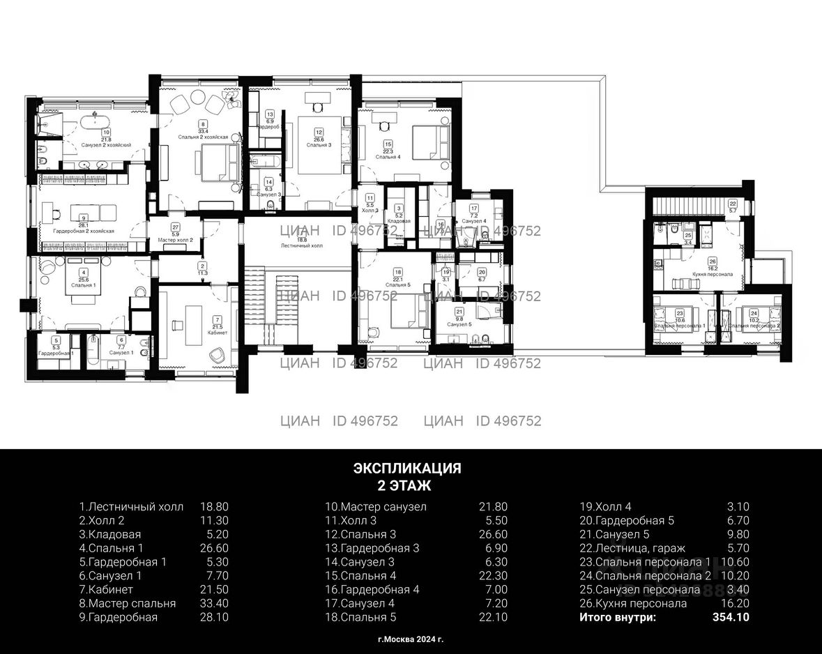 В доме 7 жилых комнат и блок персонала. 9 санузлов, 9 гардеробных. Несколько технических помещений. Высота потолков составляет 3,5 - 3,75 метра.