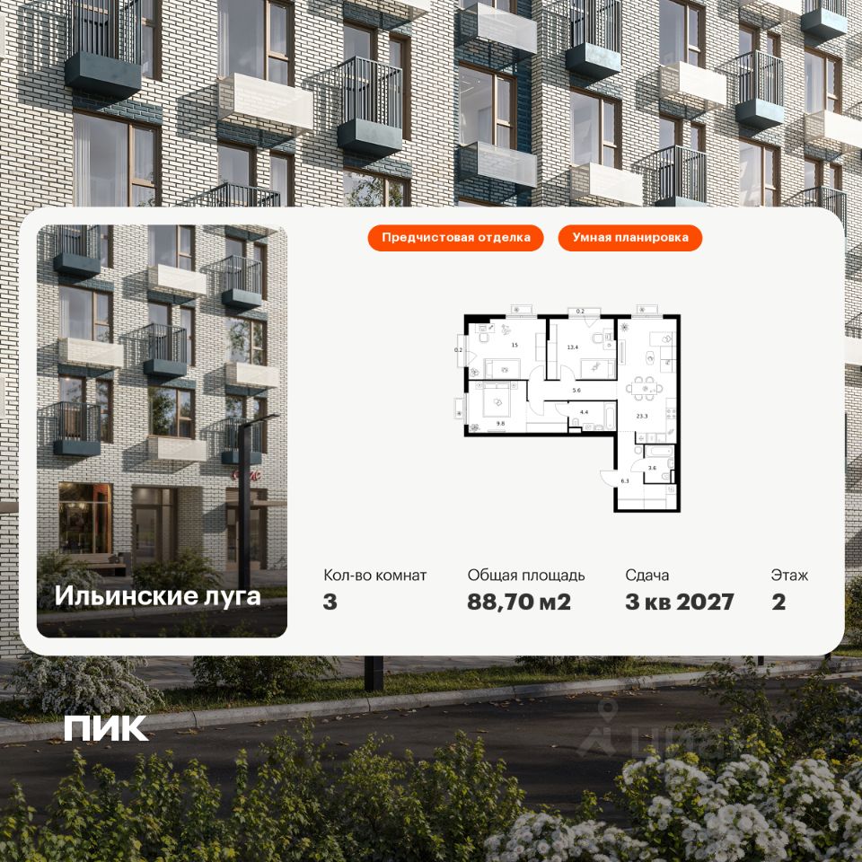 Продаётся 3-комн. квартира площадью 88,7 кв.м на 2 этаже 9 этажного дома (Корпус 3.1, Секция 1) проекта ПИК Ильинские луга. Светлый просторный подъезд на уровне земли, функциональная планировка, большие окна, предчистовая отделка.
