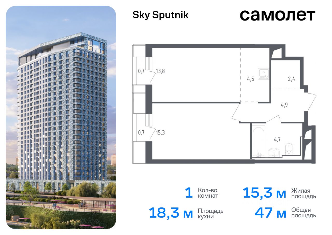 Предлагаются 1-комнатные апартаменты бизнес-класса 46,97 кв.м в корпусе 19 на 16 этаже, в Sky Sputnik Апартаменты без отделки. Доступность опции ''отделка'' и возможность комплектации мебелью и декором уточняйте у застройщика.