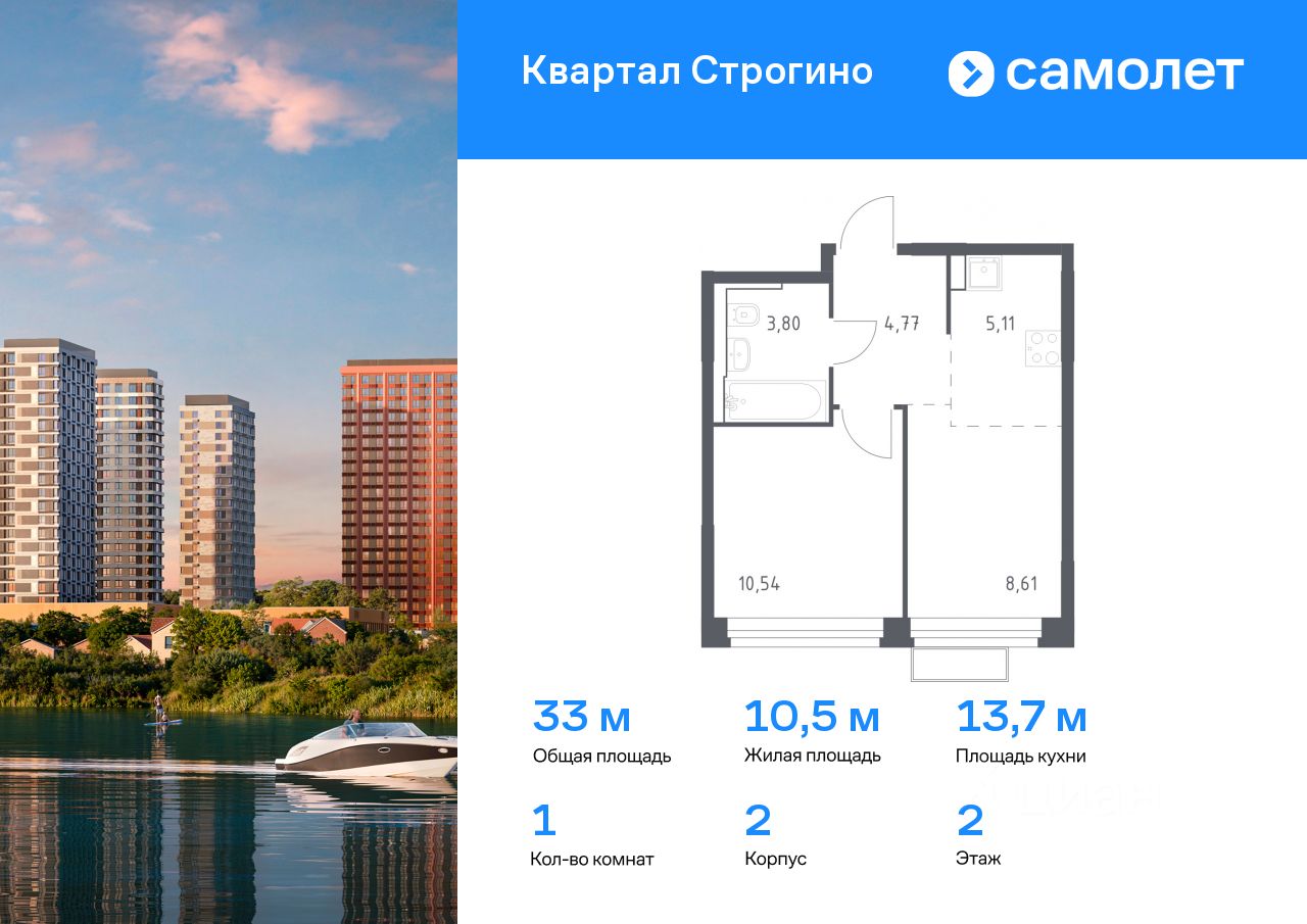 Предлагается 1-комнатная квартира комфорт-класса 33,01 кв.м в корпусе 2 на 2 этаже, в ЖК ''Квартал Строгино'' Квартира без отделки. Доступность опции ''отделка'' и возможность комплектации мебелью и декором уточняйте у застройщика.