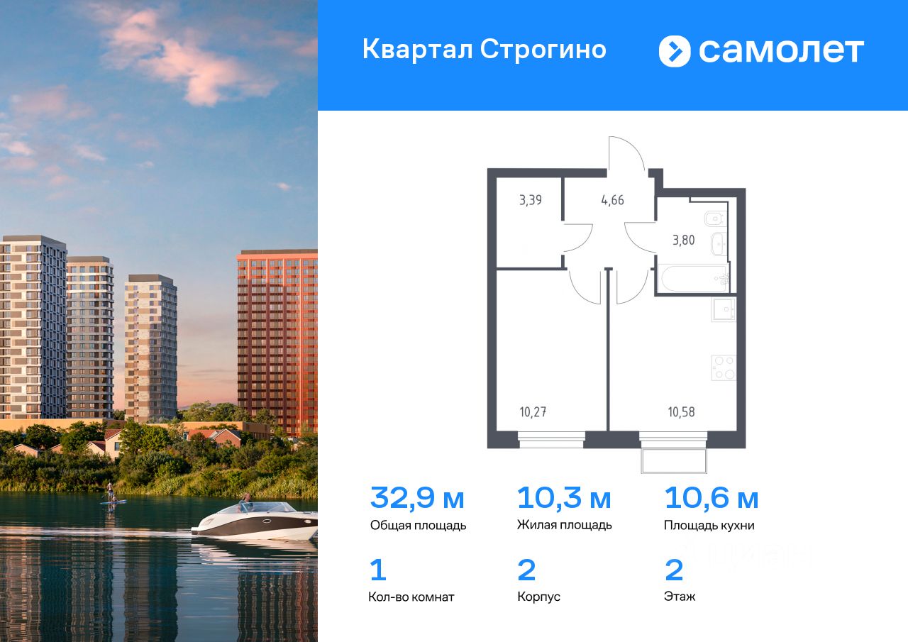 Предлагается 1-комнатная квартира комфорт-класса 32,85 кв.м в корпусе 2 на 2 этаже, в ЖК ''Квартал Строгино'' Квартира с чистовой отделкой. Доступность дополнительных опций уточняйте у застройщика.