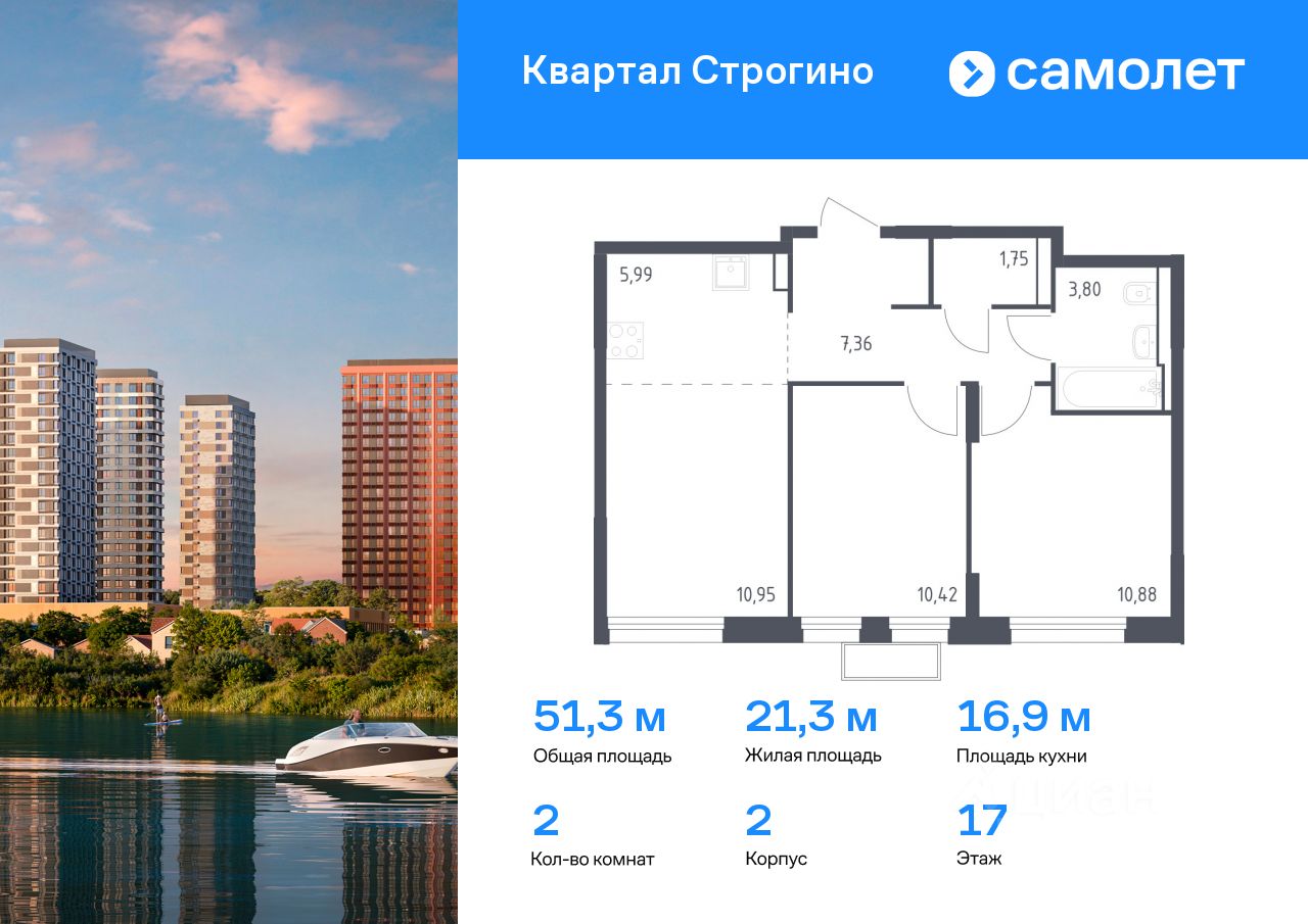 Предлагается 2-комнатная квартира комфорт-класса 51,26 кв.м в корпусе 2 на 17 этаже, в ЖК ''Квартал Строгино'' Квартира без отделки. Доступность опции ''отделка'' и возможность комплектации мебелью и декором уточняйте у застройщика.