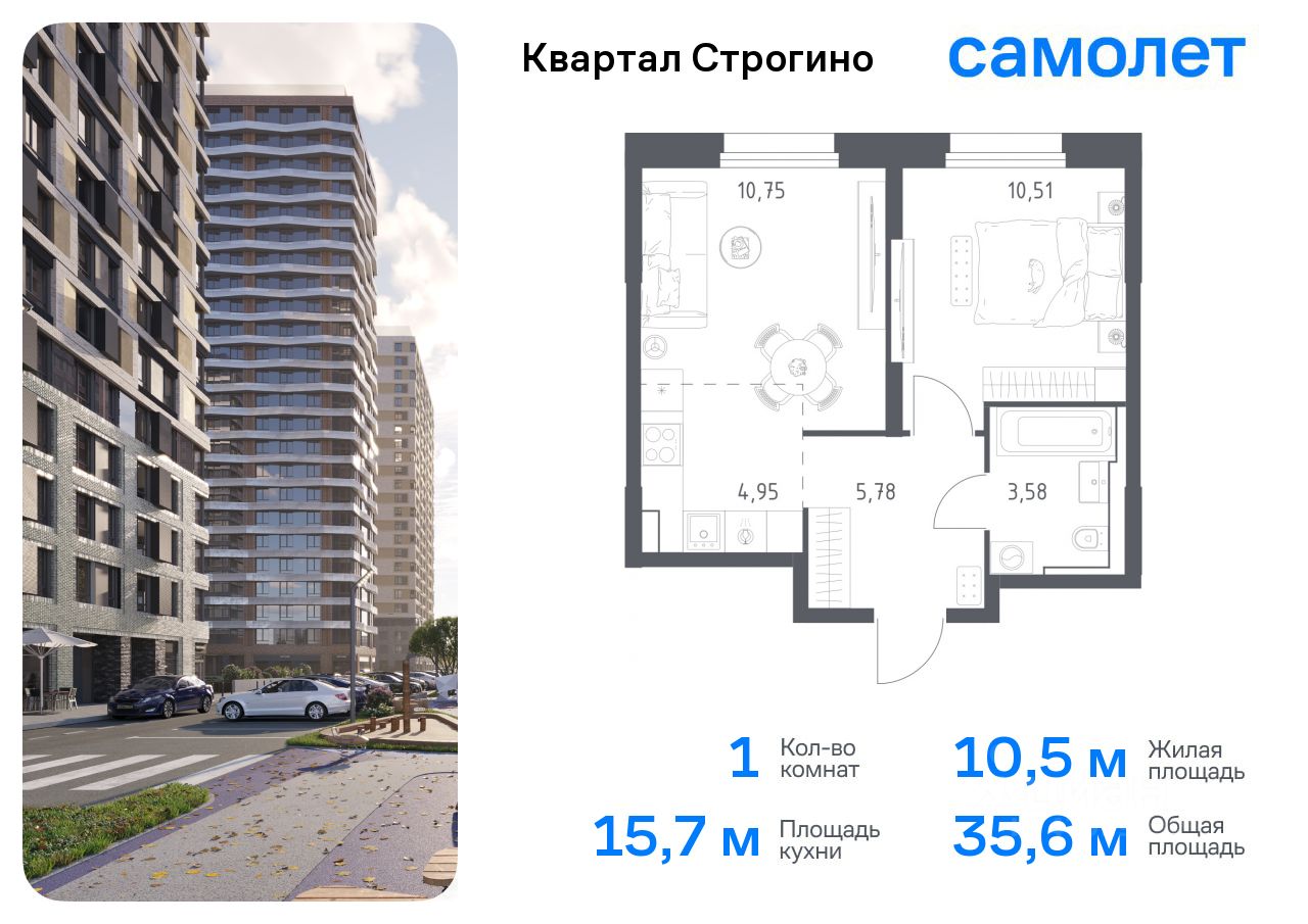Предлагается 1-комнатная квартира комфорт-класса 35,57 кв.м в корпусе 1 на 2 этаже, в ЖК ''Квартал Строгино'' Квартира с чистовой отделкой. Доступность дополнительных опций уточняйте у застройщика.