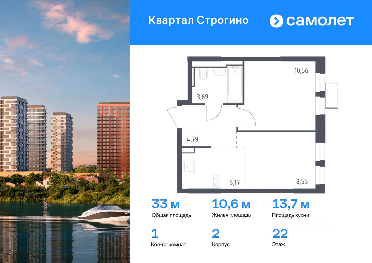 Предлагается 1-комнатная квартира комфорт-класса 33,04 кв.м в корпусе 2 на 22 этаже, в ЖК ''Квартал Строгино'' Квартира с чистовой отделкой. Доступность дополнительных опций уточняйте у застройщика.