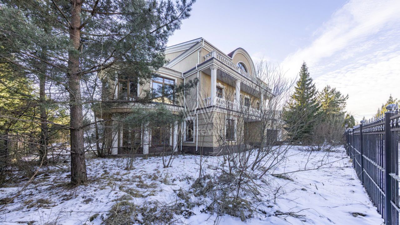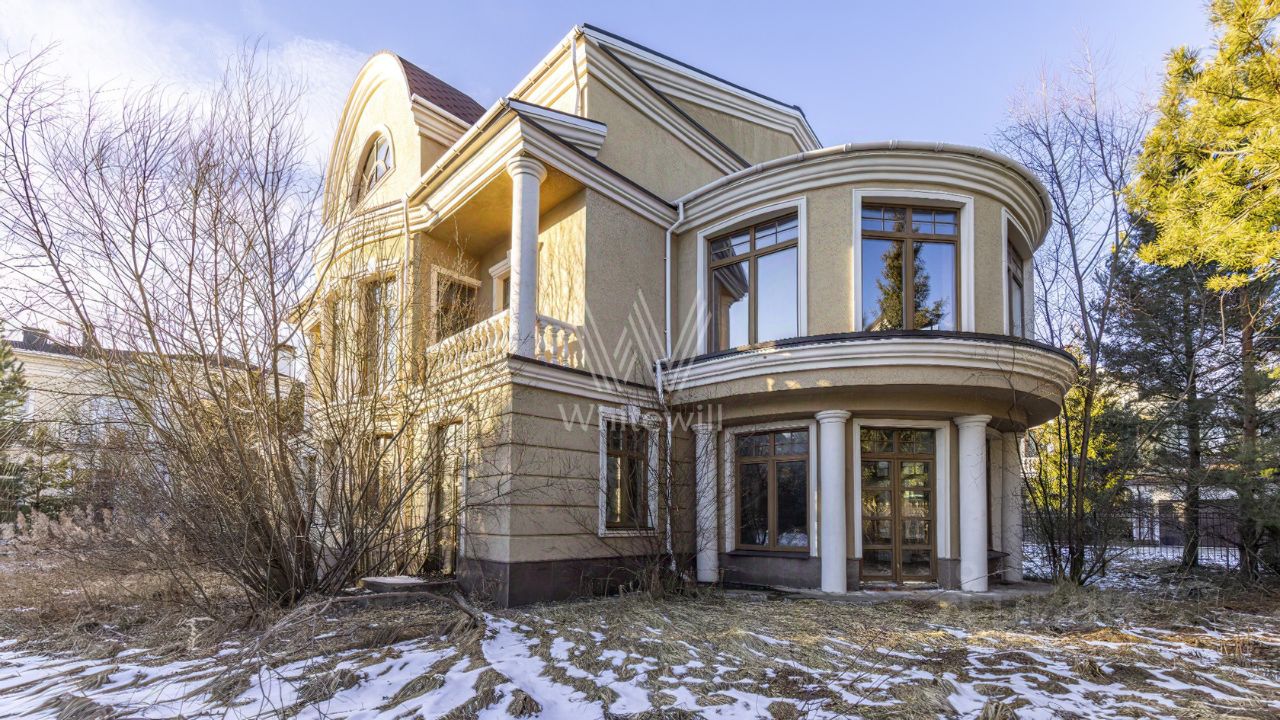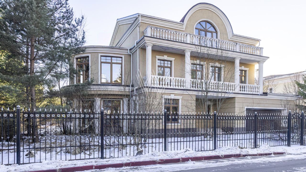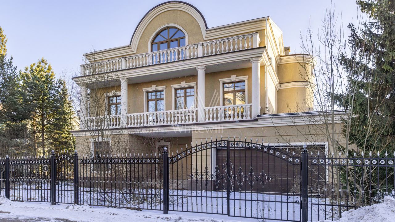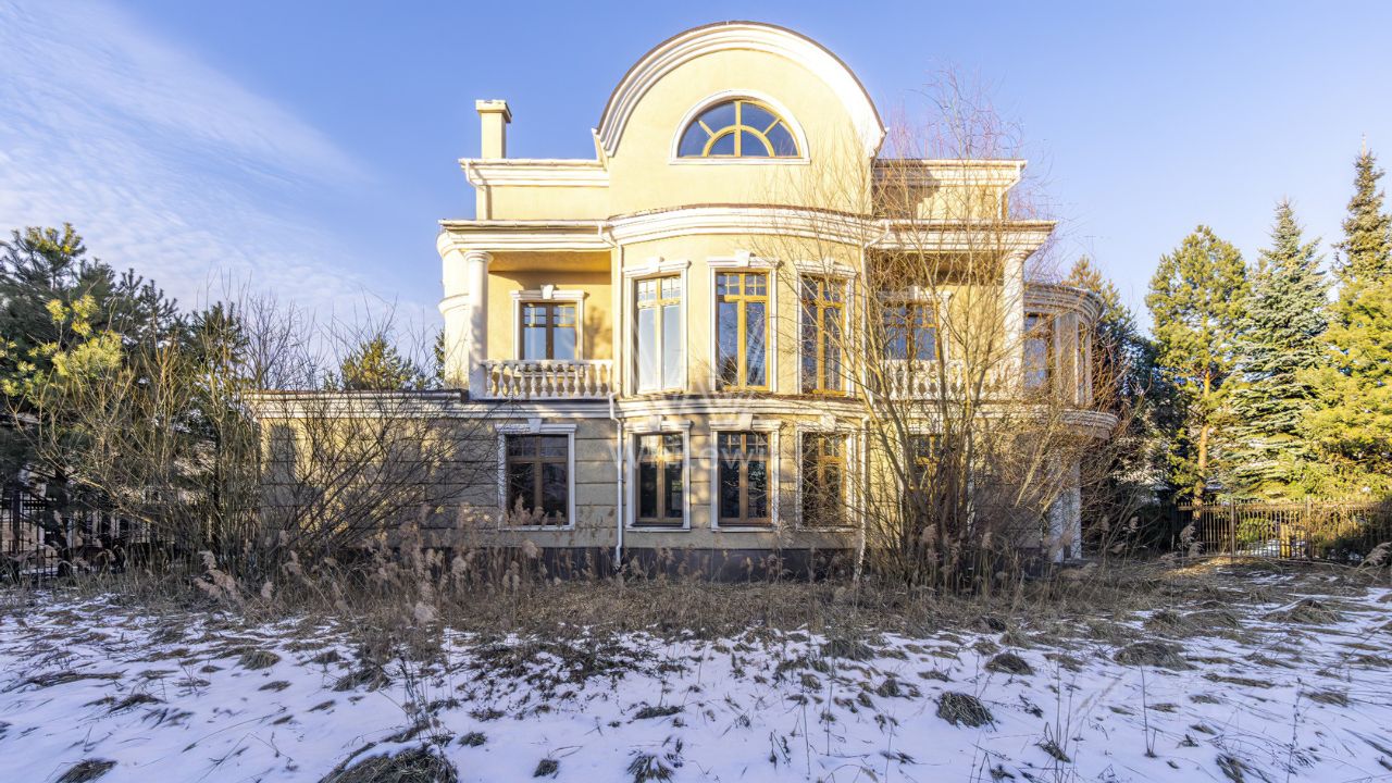 ID 13 353. Новахово. Трехэтажный коттедж площадью 600 м² построен на участке 18 соток. Здание спроектировано в классическом стиле и облицовано светло-бежевой штукатуркой. Симметричность подчеркнута массивными колоннами с рельефными капителями, наличниками и сандриками с замковыми камнями. Балконы с балясинами над входом добавляют архитектурной легкости. Боковой фасад выделяется эркером с витражами, который органично переходит в колоннаду, придавая коттеджу утончённый и динамичный вид.