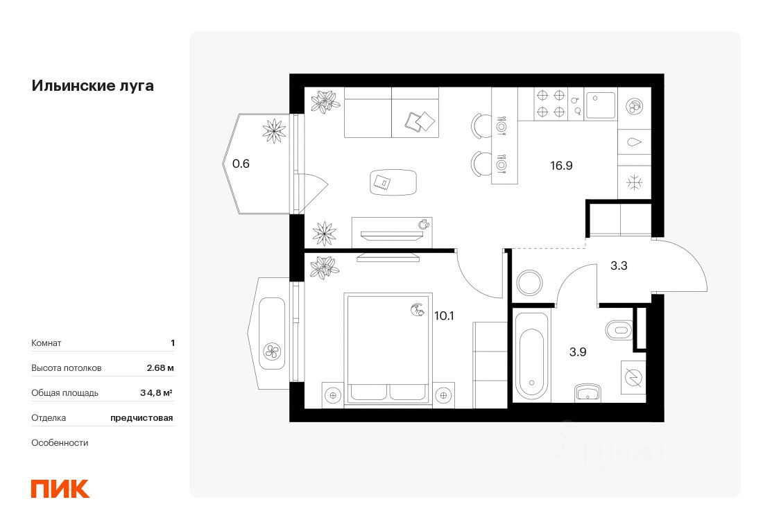 Продаётся 1-комн. квартира площадью 34,8 кв.м на 3 этаже 9 этажного дома (Корпус 3.5, Секция 3) проекта ПИК Ильинские луга. Светлый просторный подъезд на уровне земли, функциональная планировка, большие окна, предчистовая отделка.