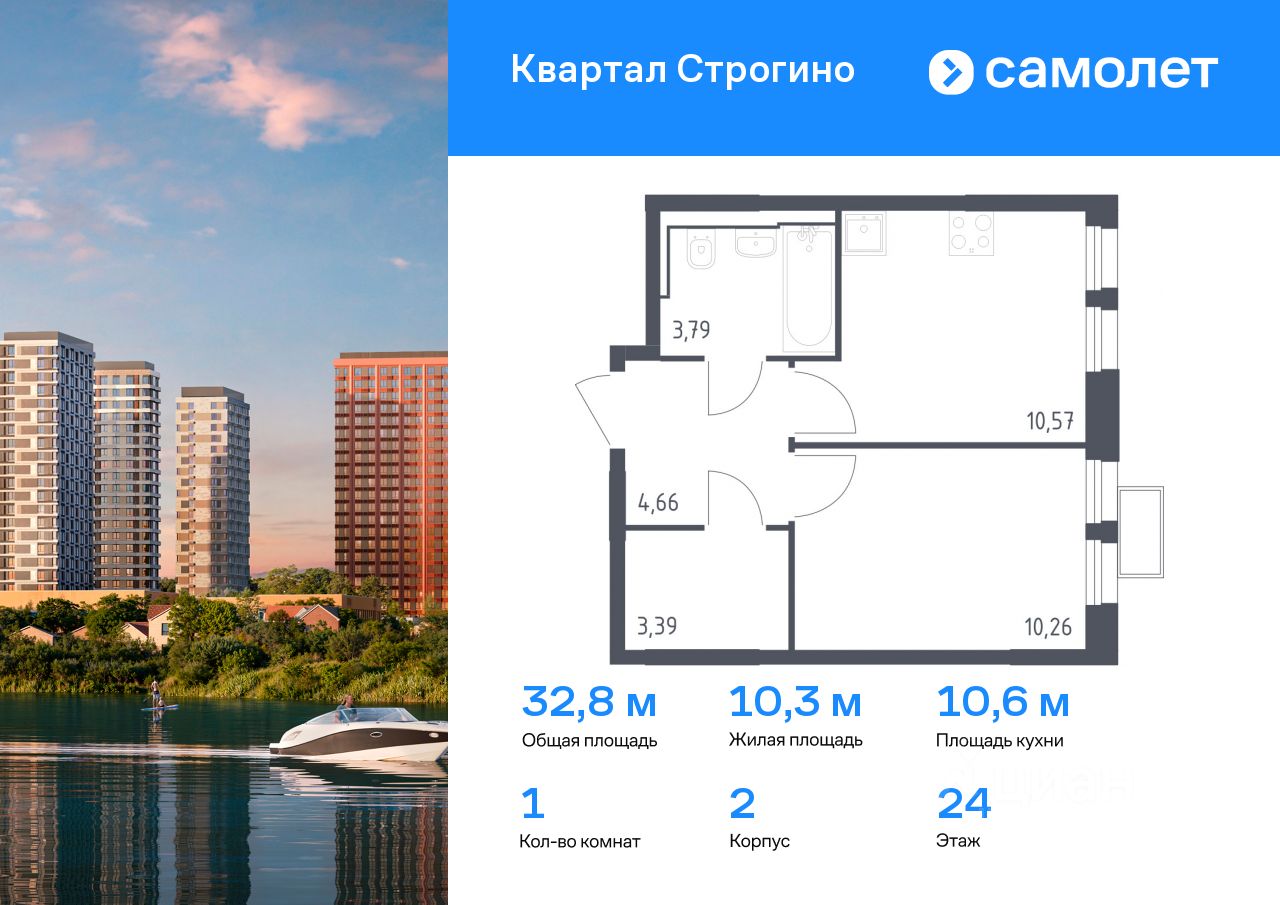 Предлагается 1-комнатная квартира комфорт-класса 32,84 кв.м в корпусе 2 на 24 этаже, в ЖК ''Квартал Строгино'' Квартира с чистовой отделкой. Доступность дополнительных опций уточняйте у застройщика.