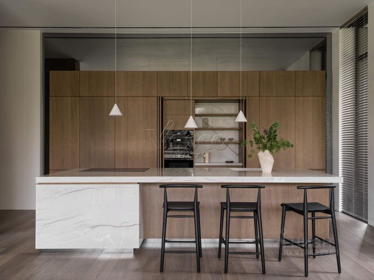 В отделке используются только премиальные материалы: мрамор (отделка камина, раковина в гостевом с/у, хаммам, прихожая, мужская мастер-ванная), кварцит (женская мастер-ванная, остров на кухне), инженерная доска из дуба (на полу), тик (потолок бассейна), кедр и абаш (сауна).