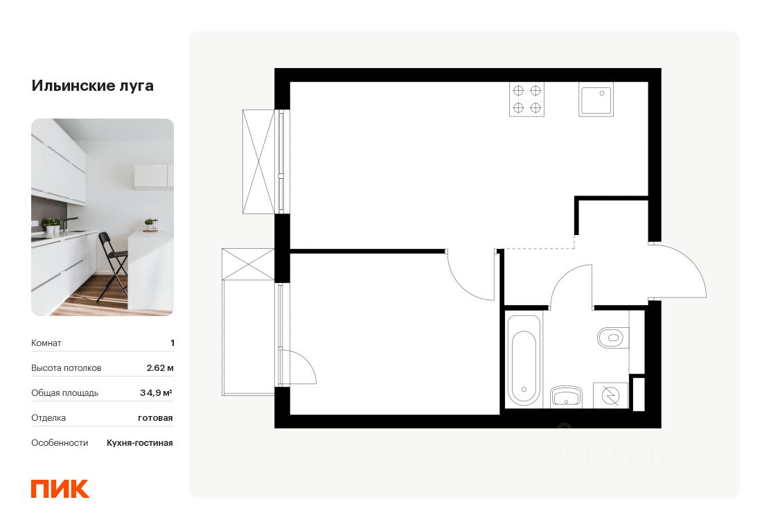 Продаётся 1-комн. квартира площадью 34,9 кв.м на 4 этаже 9 этажного дома (Корпус 3.3, Секция 5) проекта ПИК Ильинские луга. Светлый просторный подъезд на уровне земли, функциональная планировка, большие окна, .