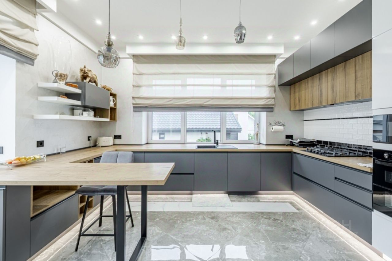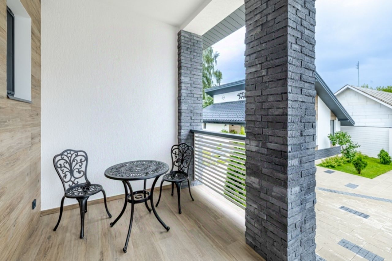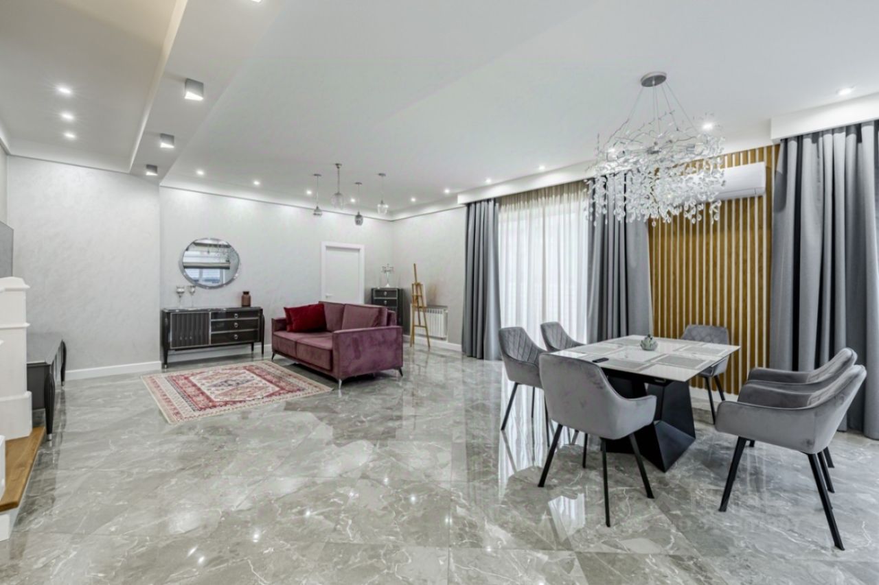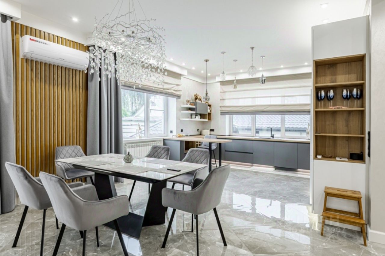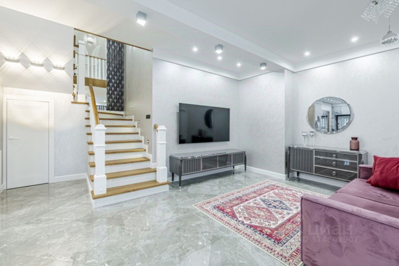 Дом разделен на две, независимые части с отдельным входом в каждую. В каждой части - 3 спальни, 2 санузла, полностью оборудованная кухня-столовая, гостиная, гардеробная, постирочная, кабинет. Одна половина полностью меблирована. В каждой спальне установлены кондиционеры, на первом этаже и санузлах теплые водяные полы, в отделке использованы дорогие отделочные материалы - плитка Испания, Италия, лестница отделана натуральным дубом. Под всей площадью дома на цокольном этаже расположена подземная парковка на 8 автомобилей, есть слив и дренаж для мойки автомобилей, с помещением для персонала, также в цокольной части дома расположена бойлерная.