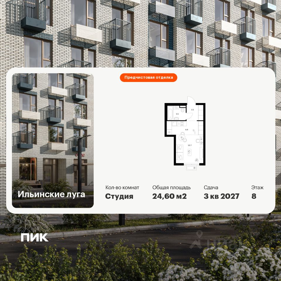 Продаётся квартира-студия площадью 24,6 кв.м на 8 этаже 9 этажного дома (Корпус 4.3, Секция 2) проекта ПИК Ильинские луга. Светлый просторный подъезд на уровне земли, функциональная планировка, большие окна, предчистовая отделка.