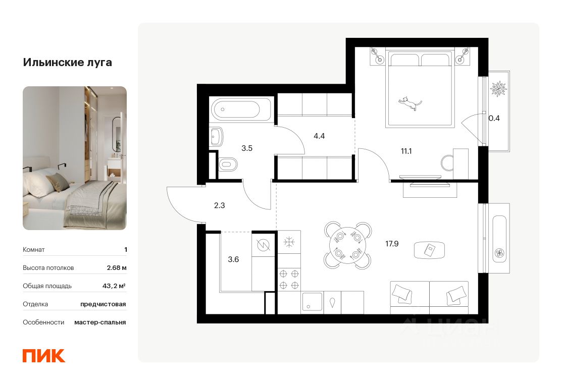 Продаётся 1-комн. квартира площадью 43,2 кв.м на 3 этаже 9 этажного дома (Корпус 4.3, Секция 1) проекта ПИК Ильинские луга. Светлый просторный подъезд на уровне земли, функциональная планировка, большие окна, предчистовая отделка.