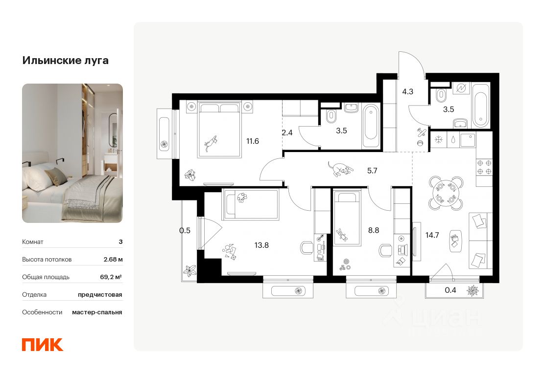 Продаётся 3-комн. квартира площадью 69,2 кв.м на 4 этаже 9 этажного дома (Корпус 4.3, Секция 4) проекта ПИК Ильинские луга. Светлый просторный подъезд на уровне земли, функциональная планировка, большие окна, предчистовая отделка.
