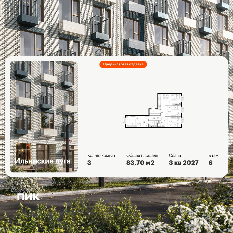 Продаётся 3-комн. квартира площадью 83,7 кв.м на 6 этаже 9 этажного дома (Корпус 4.3, Секция 6) проекта ПИК Ильинские луга. Светлый просторный подъезд на уровне земли, функциональная планировка, большие окна, предчистовая отделка.