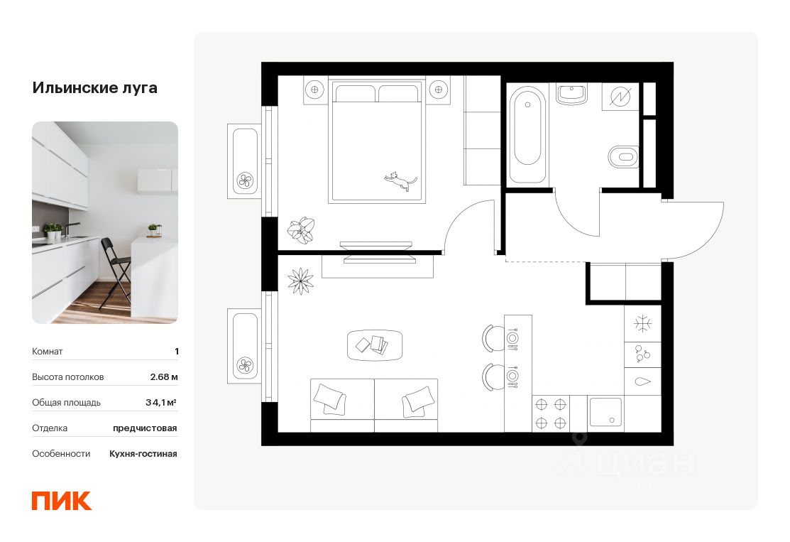 Продаётся 1-комн. квартира площадью 34,1 кв.м на 8 этаже 9 этажного дома (Корпус 4.2, Секция 3) проекта ПИК Ильинские луга. Светлый просторный подъезд на уровне земли, функциональная планировка, большие окна, .