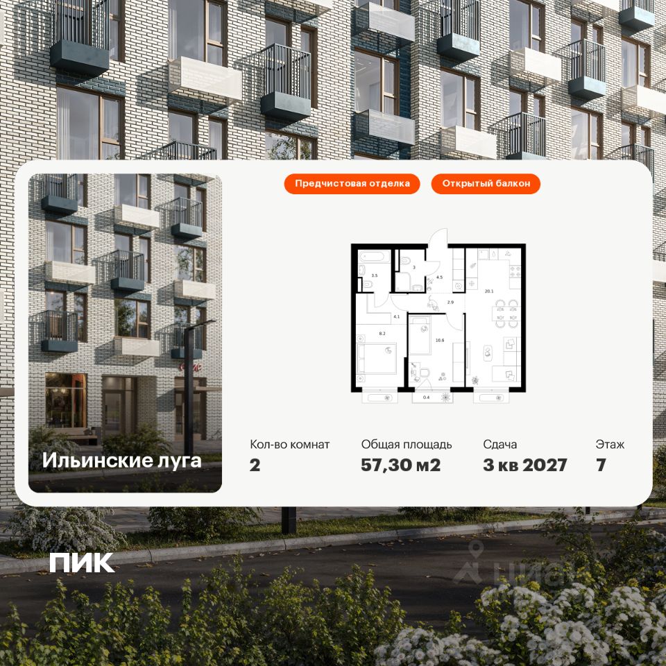 Продаётся 2-комн. квартира площадью 57,3 кв.м на 7 этаже 9 этажного дома (Корпус 4.3, Секция 4) проекта ПИК Ильинские луга. Светлый просторный подъезд на уровне земли, функциональная планировка, большие окна, предчистовая отделка.