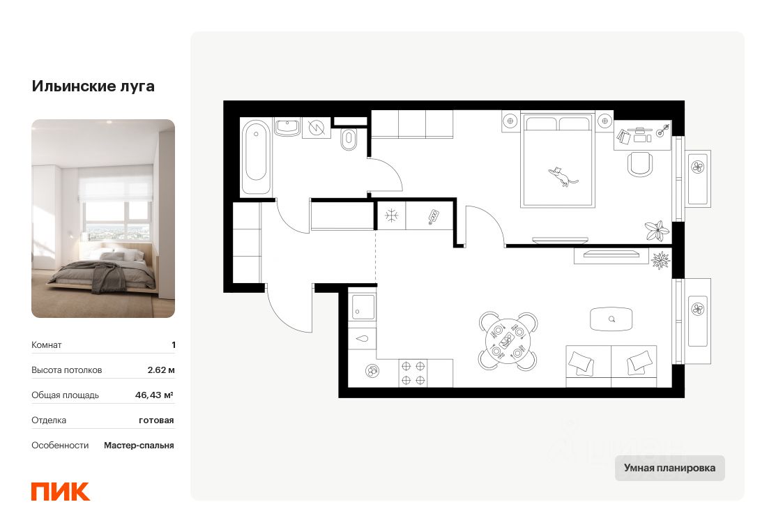 Продаётся 1-комн. квартира площадью 46,43 кв.м на 3 этаже 9 этажного дома (Корпус 4.1, Секция 4) проекта ПИК Ильинские луга. Светлый просторный подъезд на уровне земли, функциональная планировка, большие окна, .