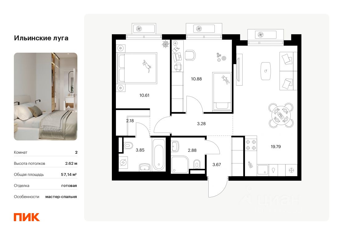 Продаётся 2-комн. квартира площадью 57,14 кв.м на 6 этаже 9 этажного дома (Корпус 4.1, Секция 1) проекта ПИК Ильинские луга. Светлый просторный подъезд на уровне земли, функциональная планировка, большие окна, c отделкой.