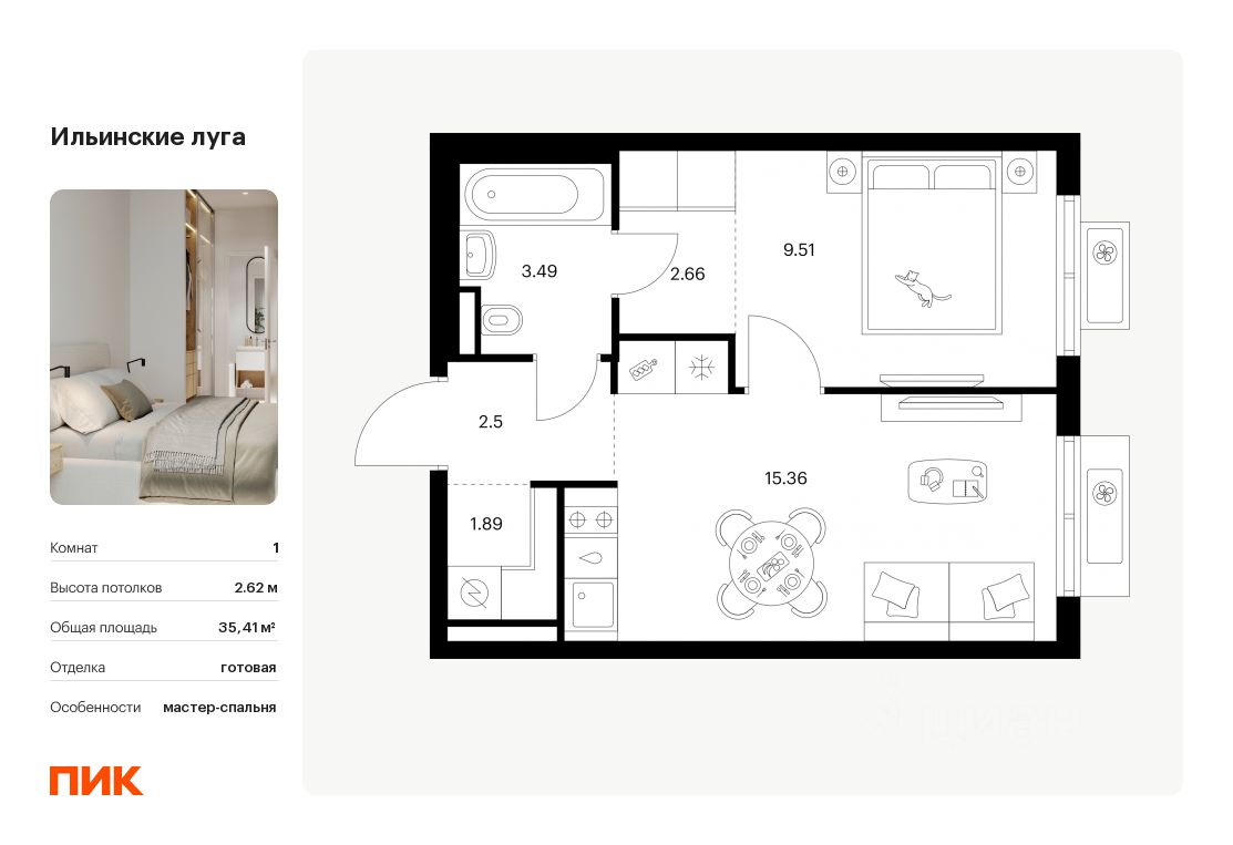 Продаётся 1-комн. квартира площадью 35,41 кв.м на 5 этаже 9 этажного дома (Корпус 4.1, Секция 5) проекта ПИК Ильинские луга. Светлый просторный подъезд на уровне земли, функциональная планировка, большие окна, c отделкой.