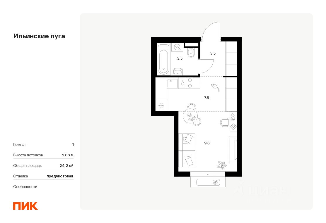 Продаётся квартира-студия площадью 24,2 кв.м на 8 этаже 9 этажного дома (Корпус 4.3, Секция 5) проекта ПИК Ильинские луга. Светлый просторный подъезд на уровне земли, функциональная планировка, большие окна, предчистовая отделка.