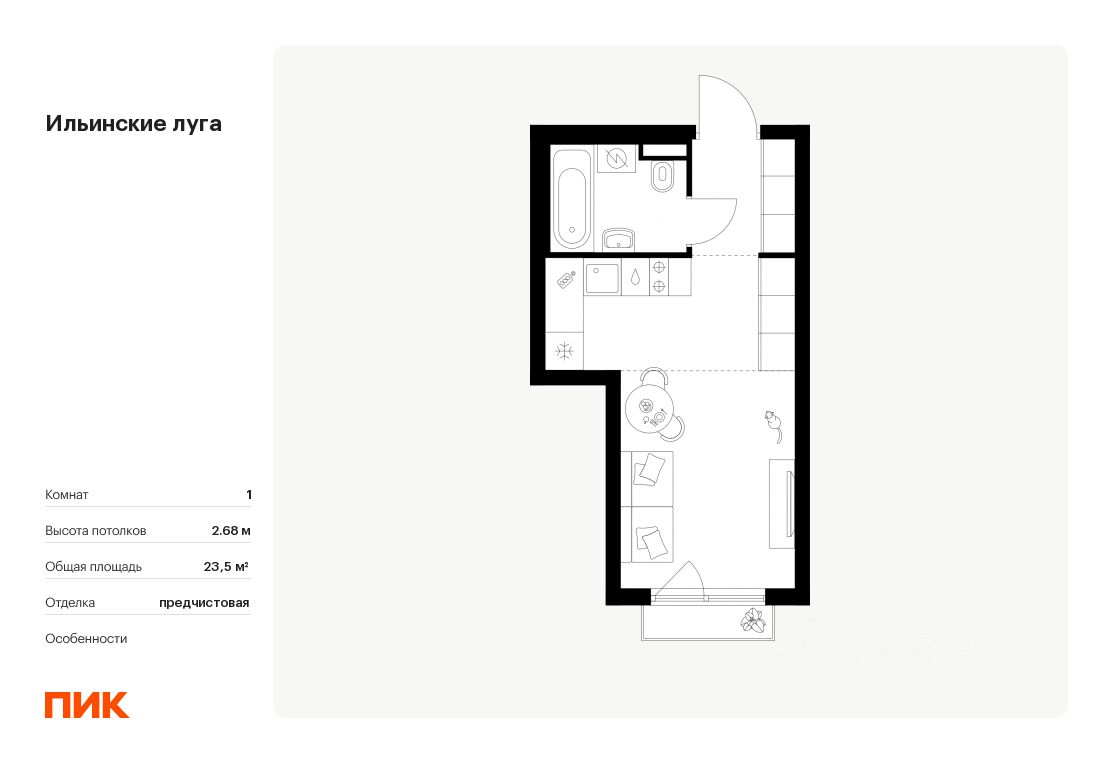 Продаётся квартира-студия площадью 23,5 кв.м на 7 этаже 9 этажного дома (Корпус 4.3, Секция 4) проекта ПИК Ильинские луга. Светлый просторный подъезд на уровне земли, функциональная планировка, большие окна, .
