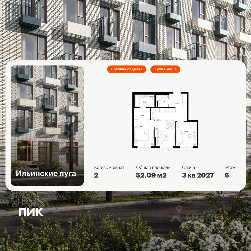 Продаётся 2-комн. квартира площадью 52,09 кв.м на 6 этаже 9 этажного дома (Корпус 4.1, Секция 5) проекта ПИК Ильинские луга. Светлый просторный подъезд на уровне земли, функциональная планировка, большие окна, c отделкой.