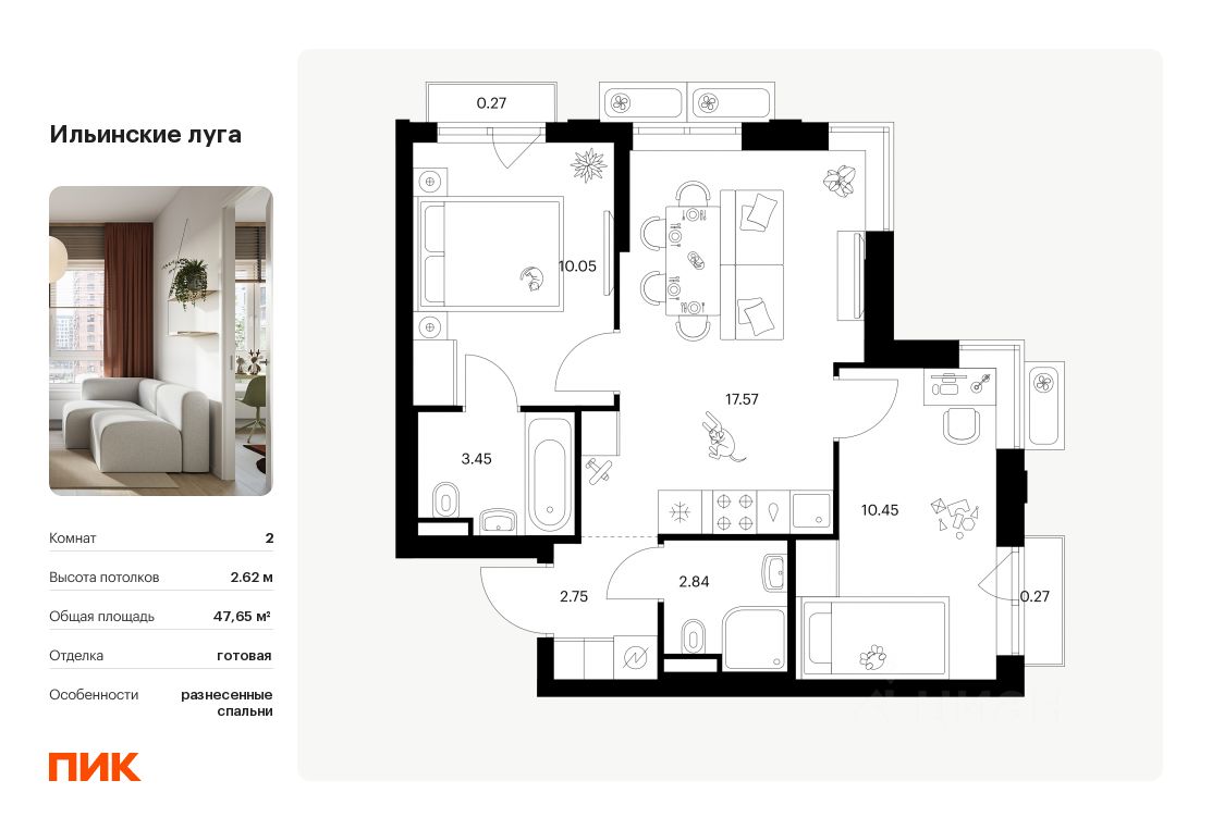 Продаётся 2-комн. квартира площадью 47,65 кв.м на 6 этаже 9 этажного дома (Корпус 4.2, Секция 1) проекта ПИК Ильинские луга. Светлый просторный подъезд на уровне земли, функциональная планировка, большие окна, c отделкой.