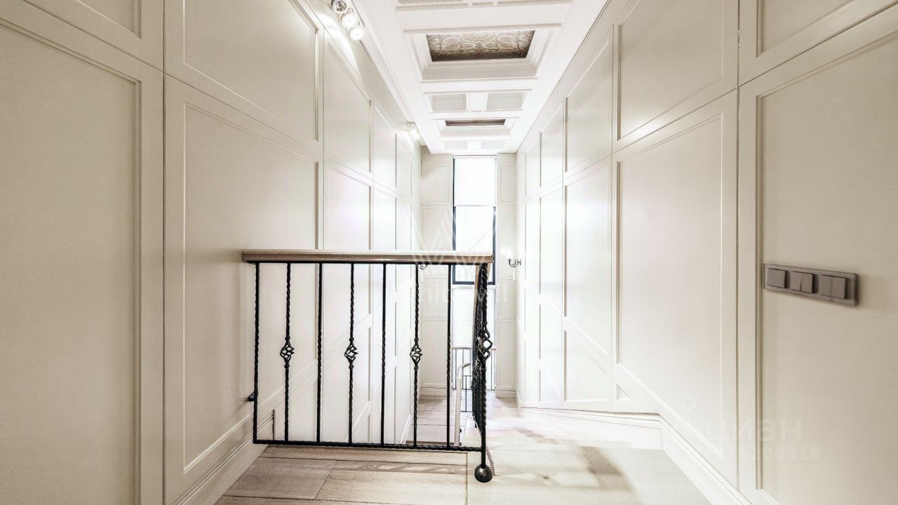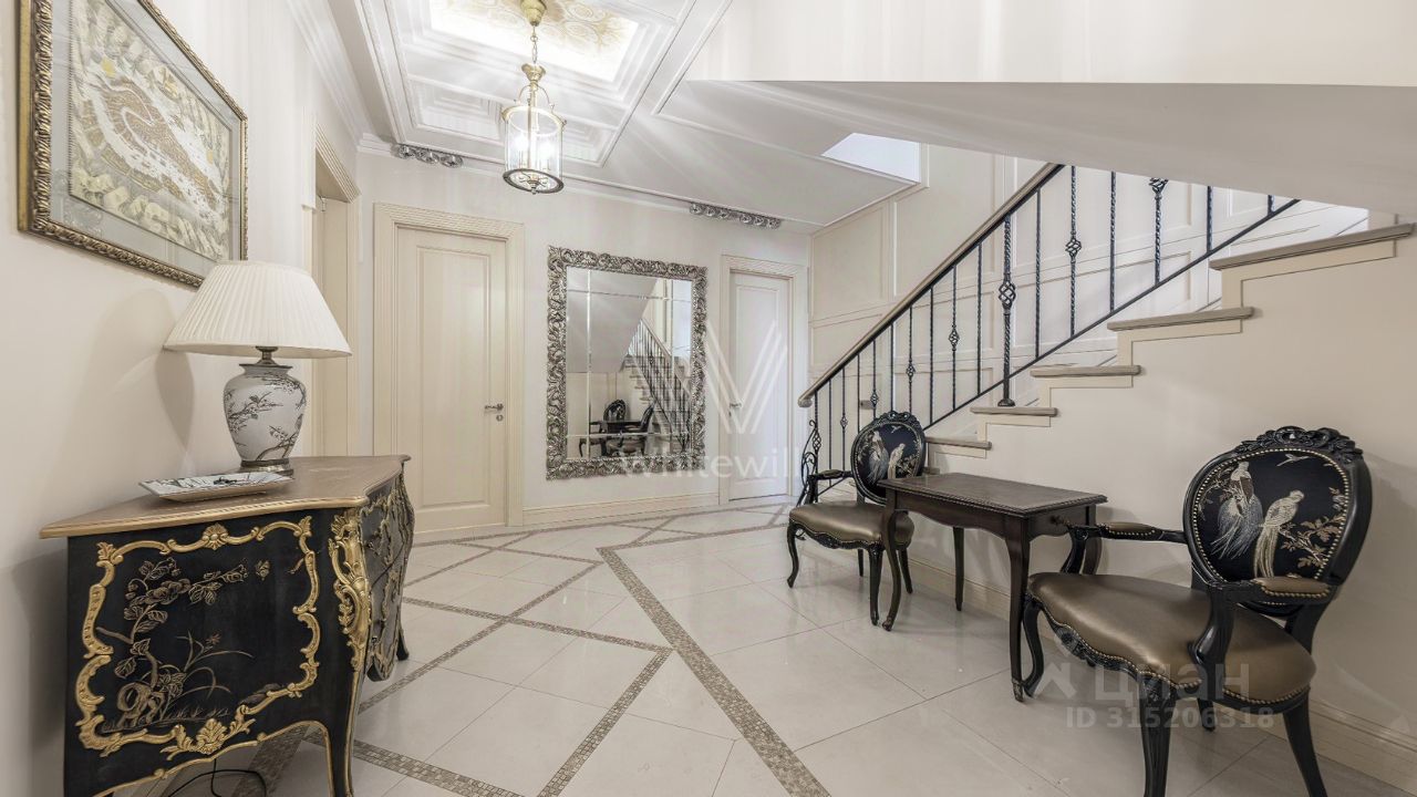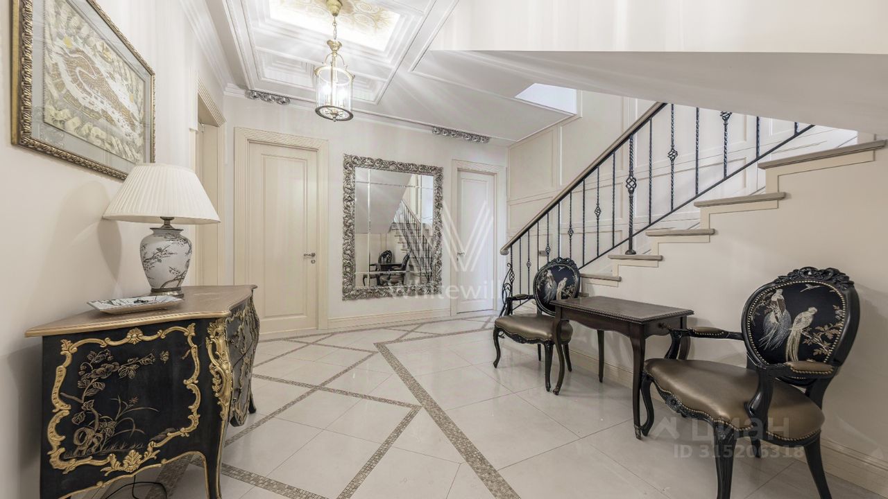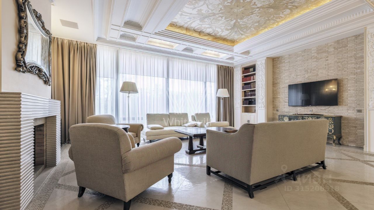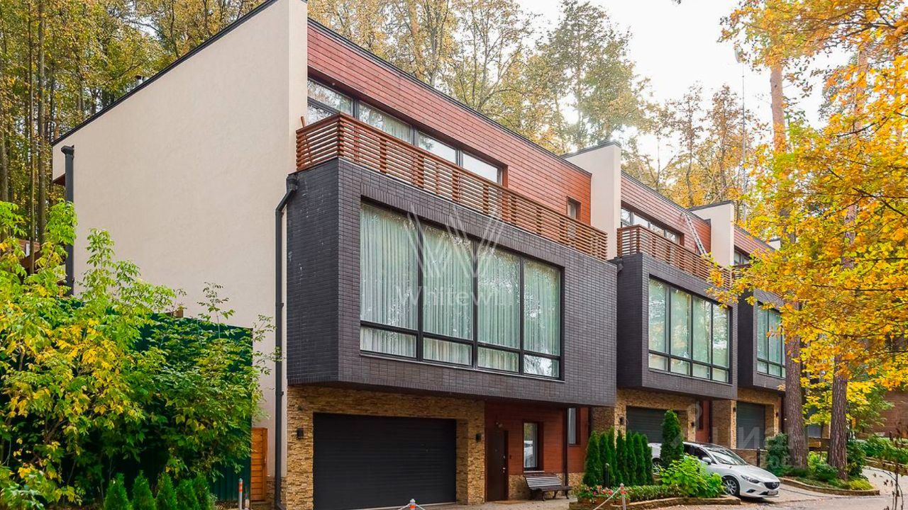 Ильинские дачи. Трехэтажный таунхаус площадью 350 м² расположен на лесном участке 5 соток. Фасад в современном стиле сочетает клинкерную плитку, штукатурку и дерево. Классический дизайн интерьера выполнен с светлых песочных оттенках, в декоре используются позолота, зеркала и орнаменты. Резиденция представлена с мебелью и техникой. Внутри спланировали 3 спальни, кухню-столовую-гостиную с камином, кабинет и гараж на 2 машины. Таунхаус оснащен системой ''умный дом''.