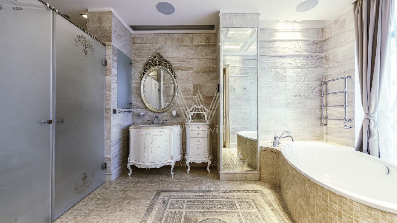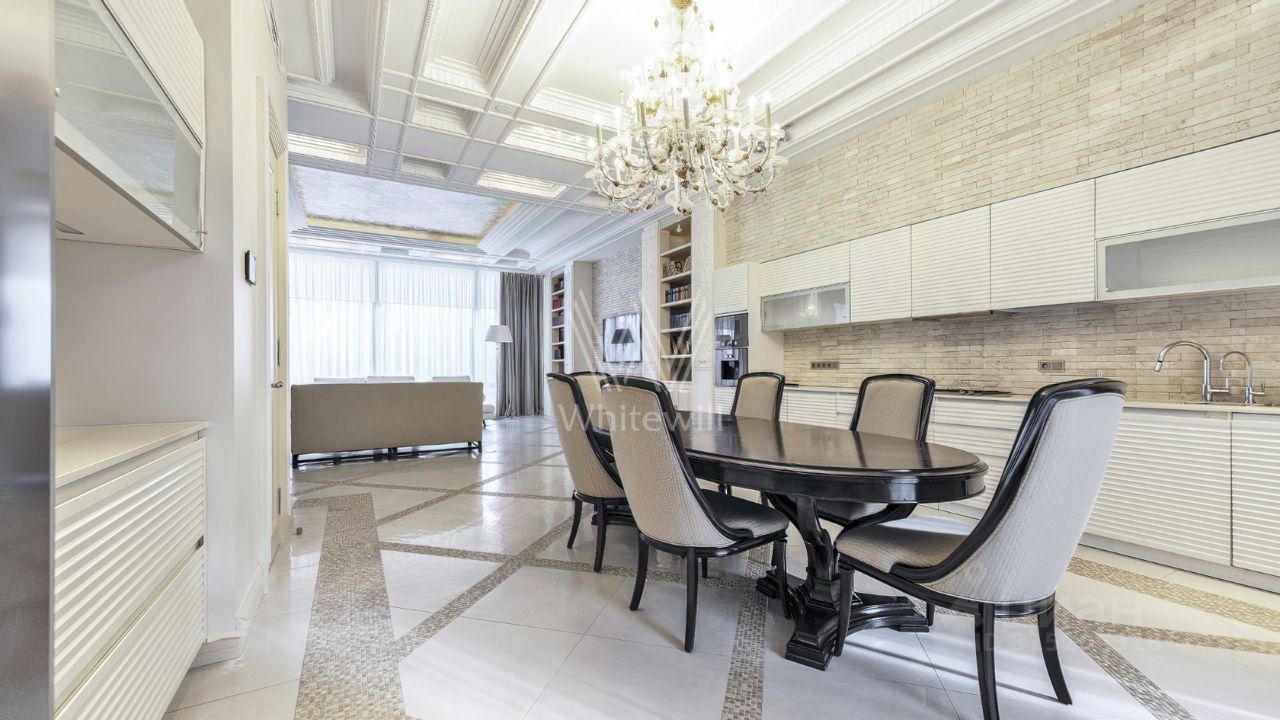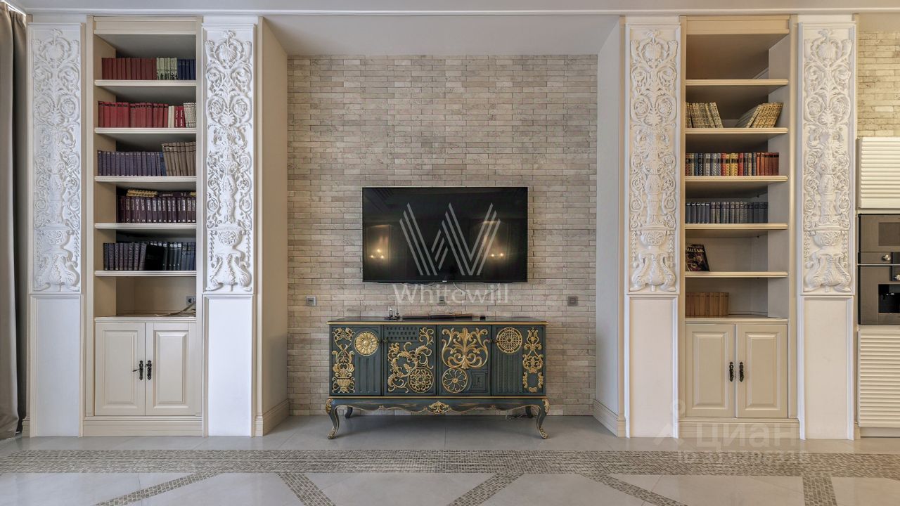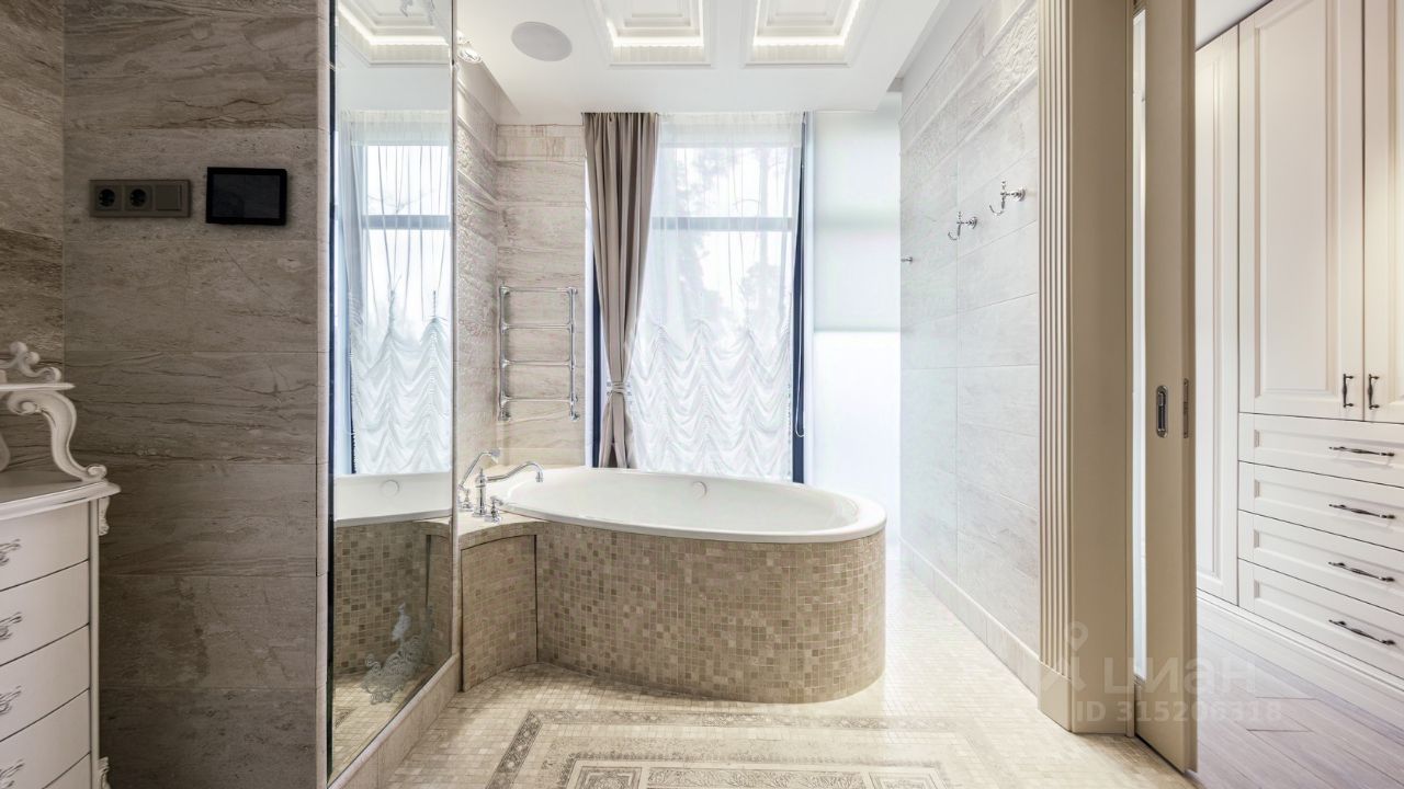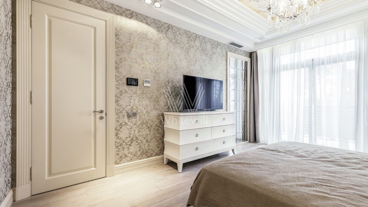 Ильинские дачи. Трехэтажный таунхаус площадью 350 м² расположен на лесном участке 5 соток. Фасад в современном стиле сочетает клинкерную плитку, штукатурку и дерево. Классический дизайн интерьера выполнен с светлых песочных оттенках, в декоре используются позолота, зеркала и орнаменты. Резиденция представлена с мебелью и техникой. Внутри спланировали 3 спальни, кухню-столовую-гостиную с камином, кабинет и гараж на 2 машины. Таунхаус оснащен системой ''умный дом''.
