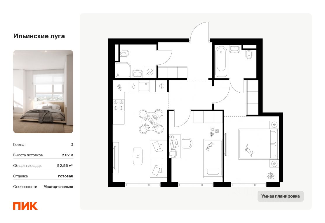 Продаётся 2-комн. квартира площадью 52,86 кв.м на 9 этаже 9 этажного дома (Корпус 4.1, Секция 2) проекта ПИК Ильинские луга. Светлый просторный подъезд на уровне земли, функциональная планировка, большие окна, .