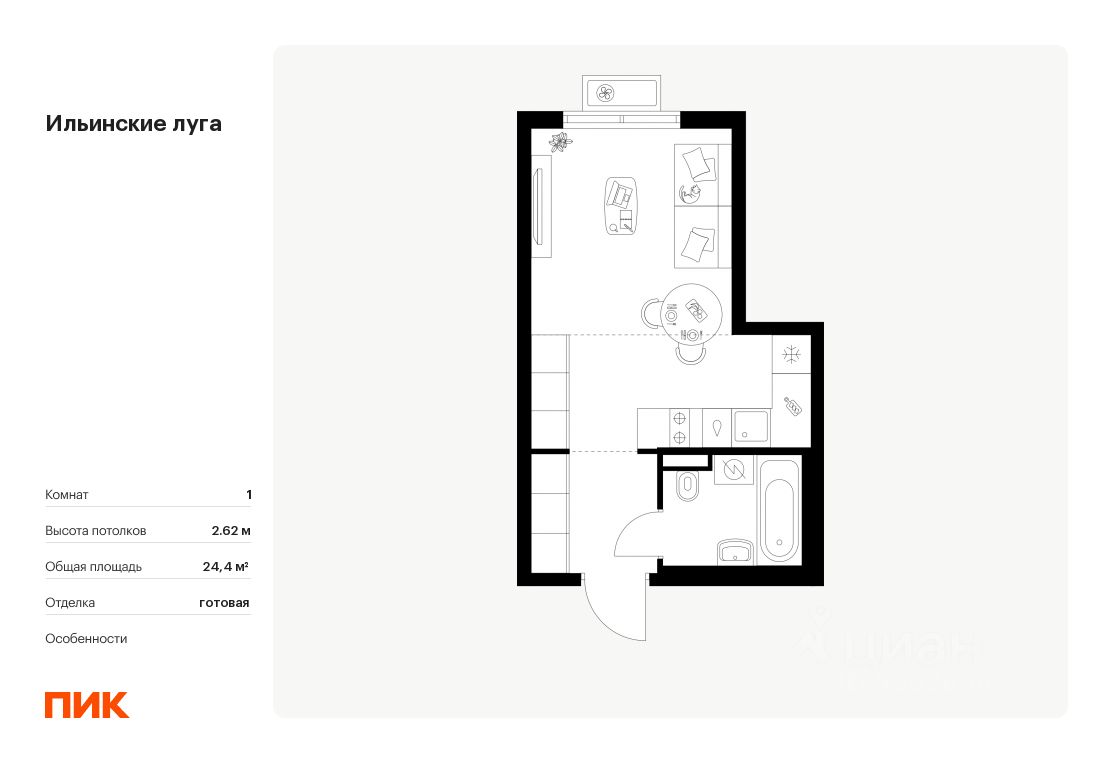 Продаётся квартира-студия площадью 24,4 кв.м на 2 этаже 9 этажного дома (Корпус 4.1, Секция 2) проекта ПИК Ильинские луга. Светлый просторный подъезд на уровне земли, функциональная планировка, большие окна, .