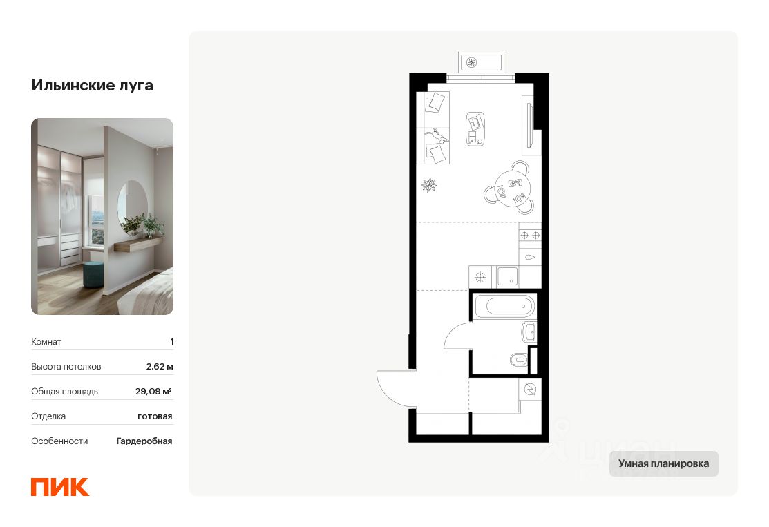 Продаётся квартира-студия площадью 29,09 кв.м на 5 этаже 9 этажного дома (Корпус 4.1, Секция 4) проекта ПИК Ильинские луга. Светлый просторный подъезд на уровне земли, функциональная планировка, большие окна, .