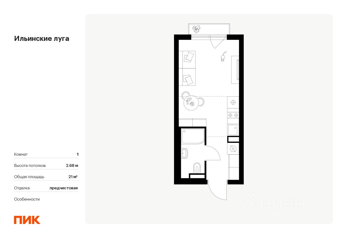 Продаётся квартира-студия площадью 21 кв.м на 6 этаже 9 этажного дома (Корпус 4.3, Секция 2) проекта ПИК Ильинские луга. Светлый просторный подъезд на уровне земли, функциональная планировка, большие окна, .