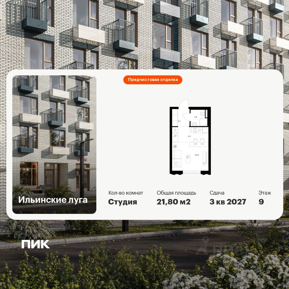 Продаётся квартира-студия площадью 21,8 кв.м на 9 этаже 9 этажного дома (Корпус 3.5, Секция 4) проекта ПИК Ильинские луга. Светлый просторный подъезд на уровне земли, функциональная планировка, большие окна, предчистовая отделка.