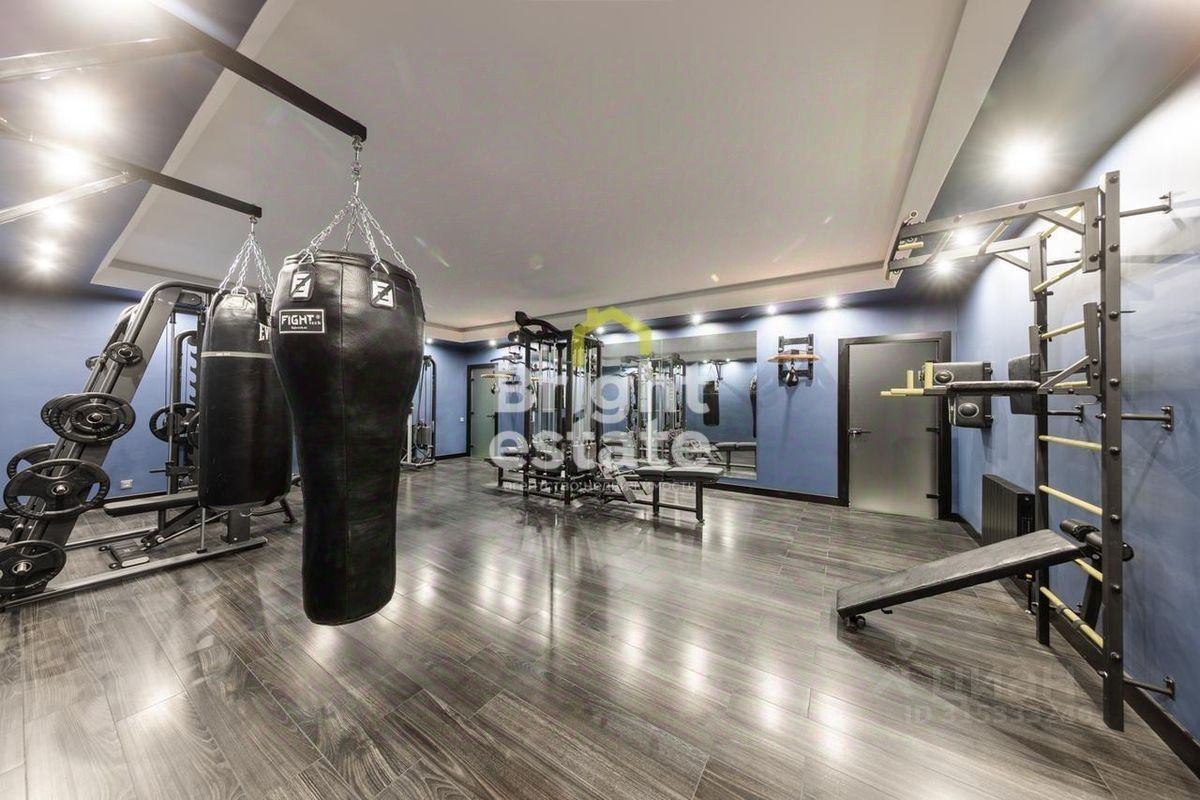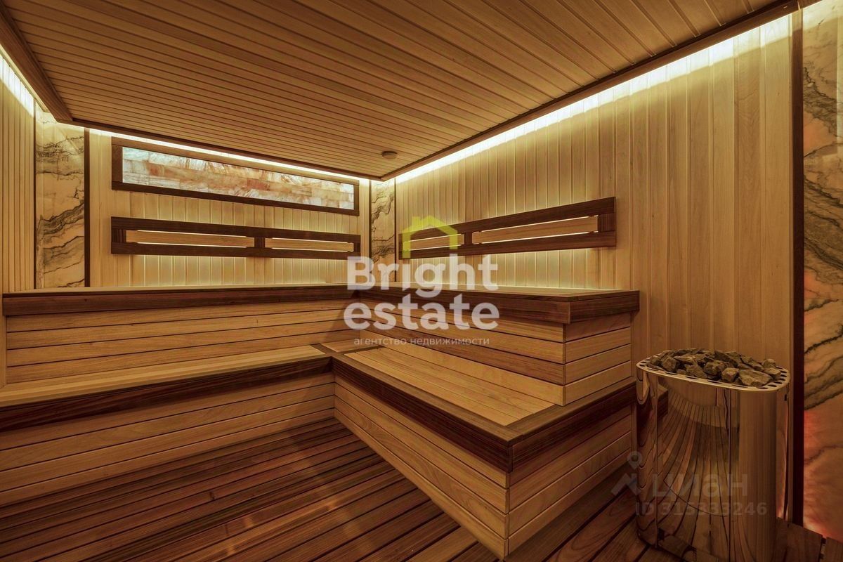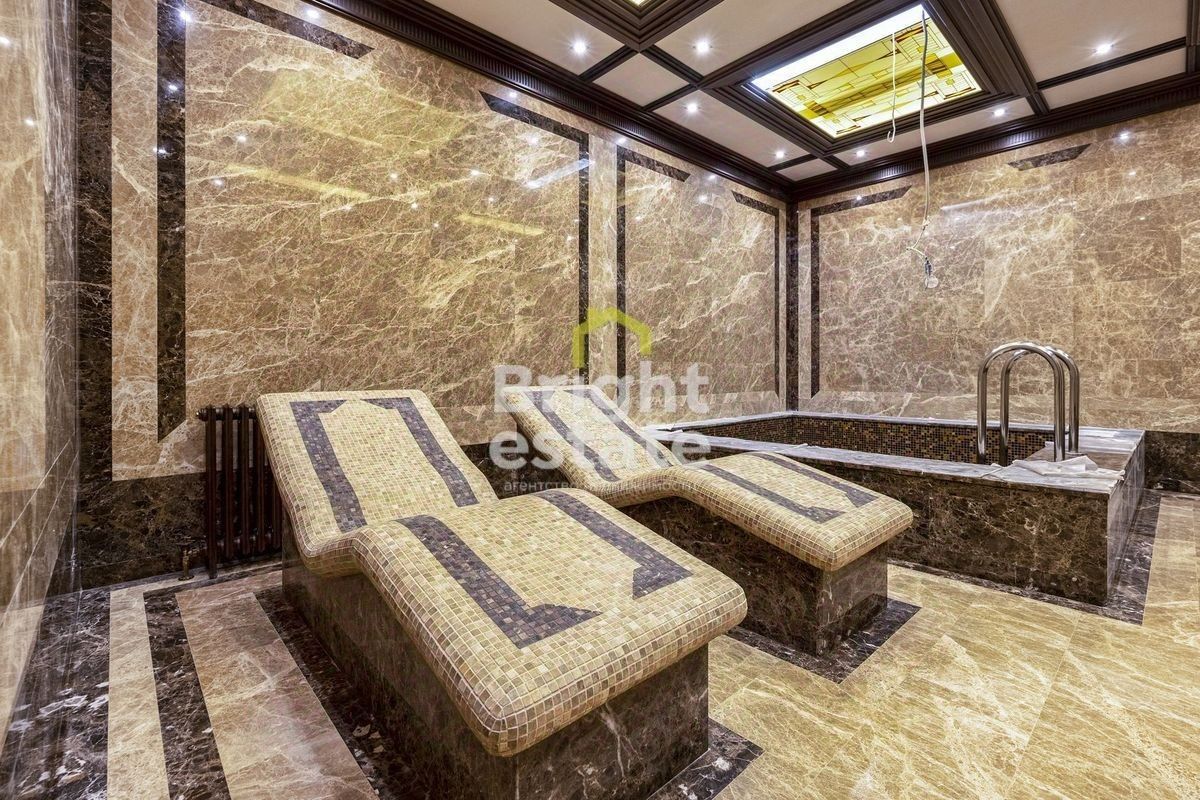 Первый этаж парадная гостиная с камином, стильная кухня-столовая с выходом на террасу, библиотека, гостевая спальня с личным санузлом и зоной отдыха. Здесь же расположен переход в просторную SPA-зону: бассейн 156 м, хамам, сауна, купель, комната отдыха, душевая, санузел и отдельный выход на террасу с джакузи и зоной барбекю.