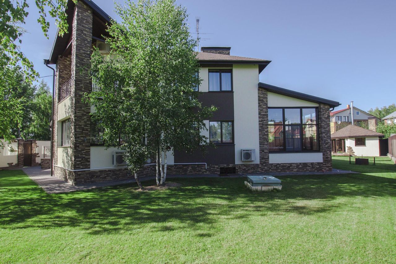 Площадь дома 500 м2, два жилых этажа цокольный этаж и мансарда.