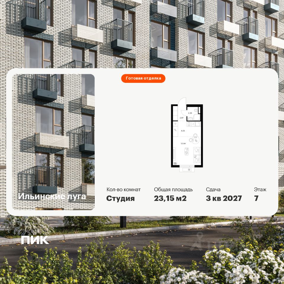 Продаётся квартира-студия площадью 23,15 кв.м на 7 этаже 9 этажного дома (Корпус 4.1, Секция 1) проекта ПИК Ильинские луга. Светлый просторный подъезд на уровне земли, функциональная планировка, большие окна, c отделкой.