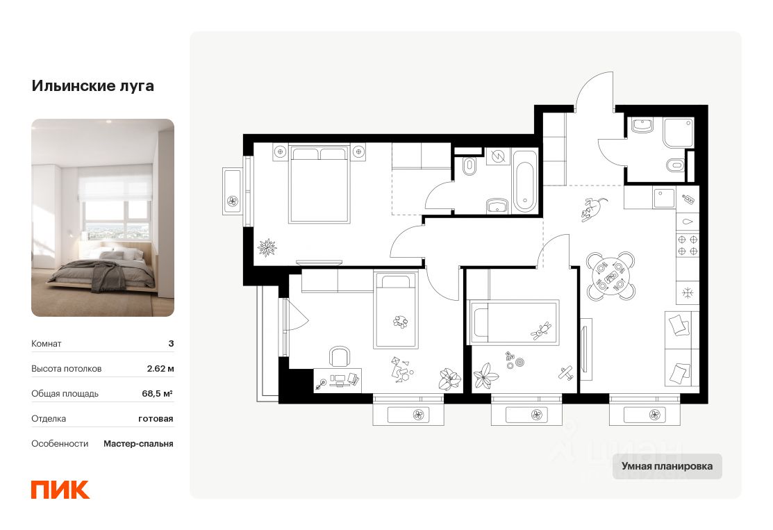 Продаётся 3-комн. квартира площадью 68,5 кв.м на 8 этаже 9 этажного дома (Корпус 4.1, Секция 4) проекта ПИК Ильинские луга. Светлый просторный подъезд на уровне земли, функциональная планировка, большие окна, .