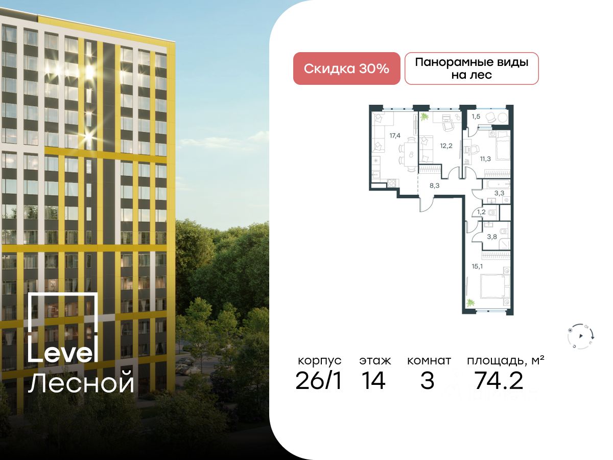 В районе, утопающем в густой зелени лесов, многочисленных парков и скверов, продаётся 3-комнатная квартира площадью 74.20 кв.м с отделкой white box. Квартира расположена на 14 этаже в жилом комплексе комфорт-класса Level Лесной (компания Level Group/Левел групп).