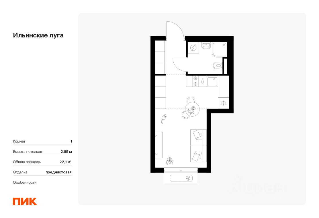 Продаётся квартира-студия площадью 22,1 кв.м на 6 этаже 9 этажного дома (Корпус 4.3, Секция 3) проекта ПИК Ильинские луга. Светлый просторный подъезд на уровне земли, функциональная планировка, большие окна, .