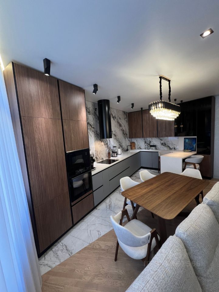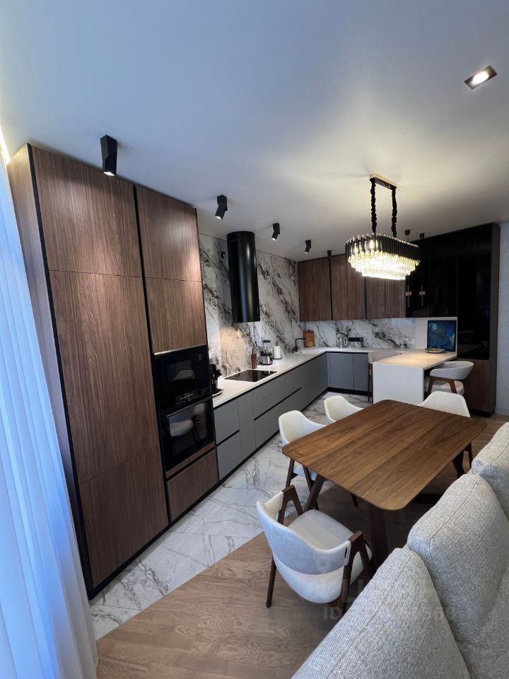 Просторная кухня-гостиная от фирмы ''Стильные кухни'', выполненная с учетом последних тенденций и smart-технологий, включает ВСТРОЕННЫЕ: варочную панель, духовой шкаф, вытяжку, посудомоечную и стиральную машины, холодильник. Все это дополняет особенный элемент интерьера - барная стойка.