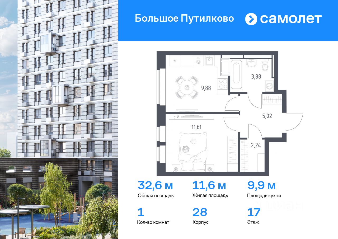 Предлагается 1-комнатная квартира комфорт-класса 32,63 кв.м в корпусе 28 на 17 этаже, в ЖК ''Большое Путилково'' Квартира без отделки. Доступность опции ''отделка'' и возможность комплектации мебелью и декором уточняйте у застройщика.