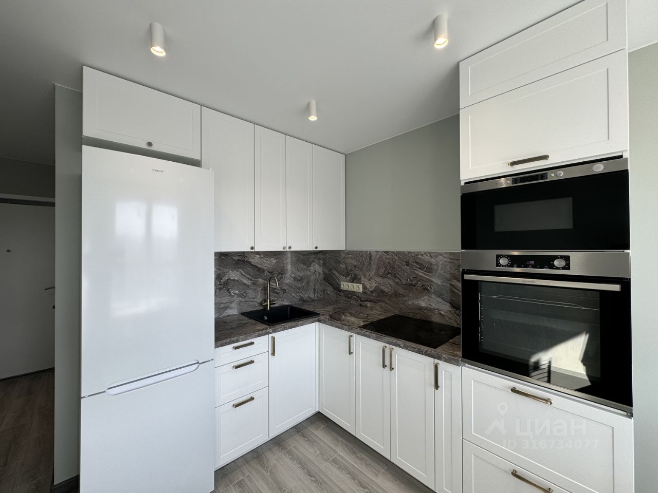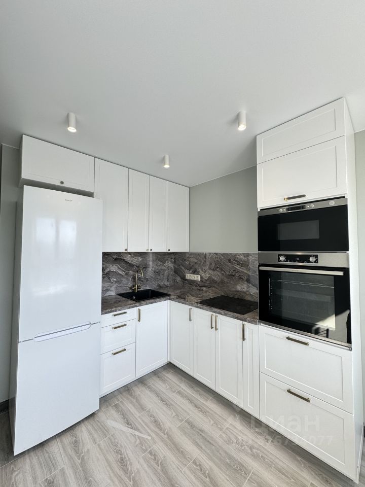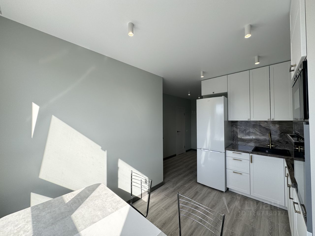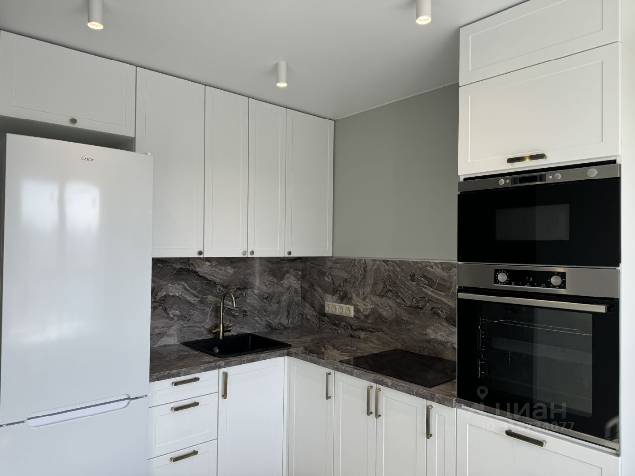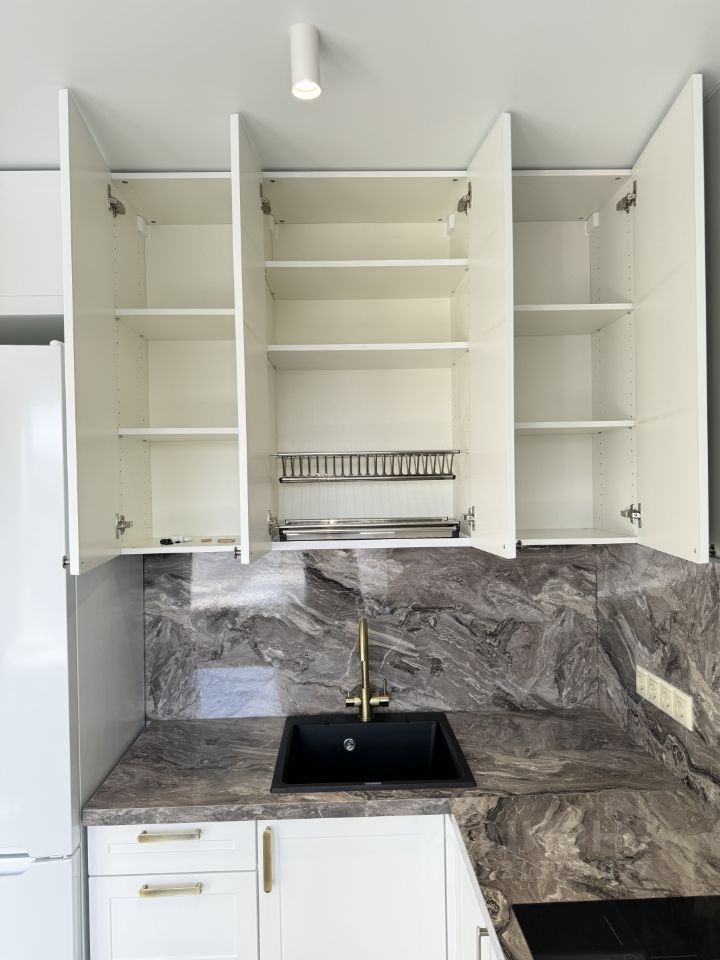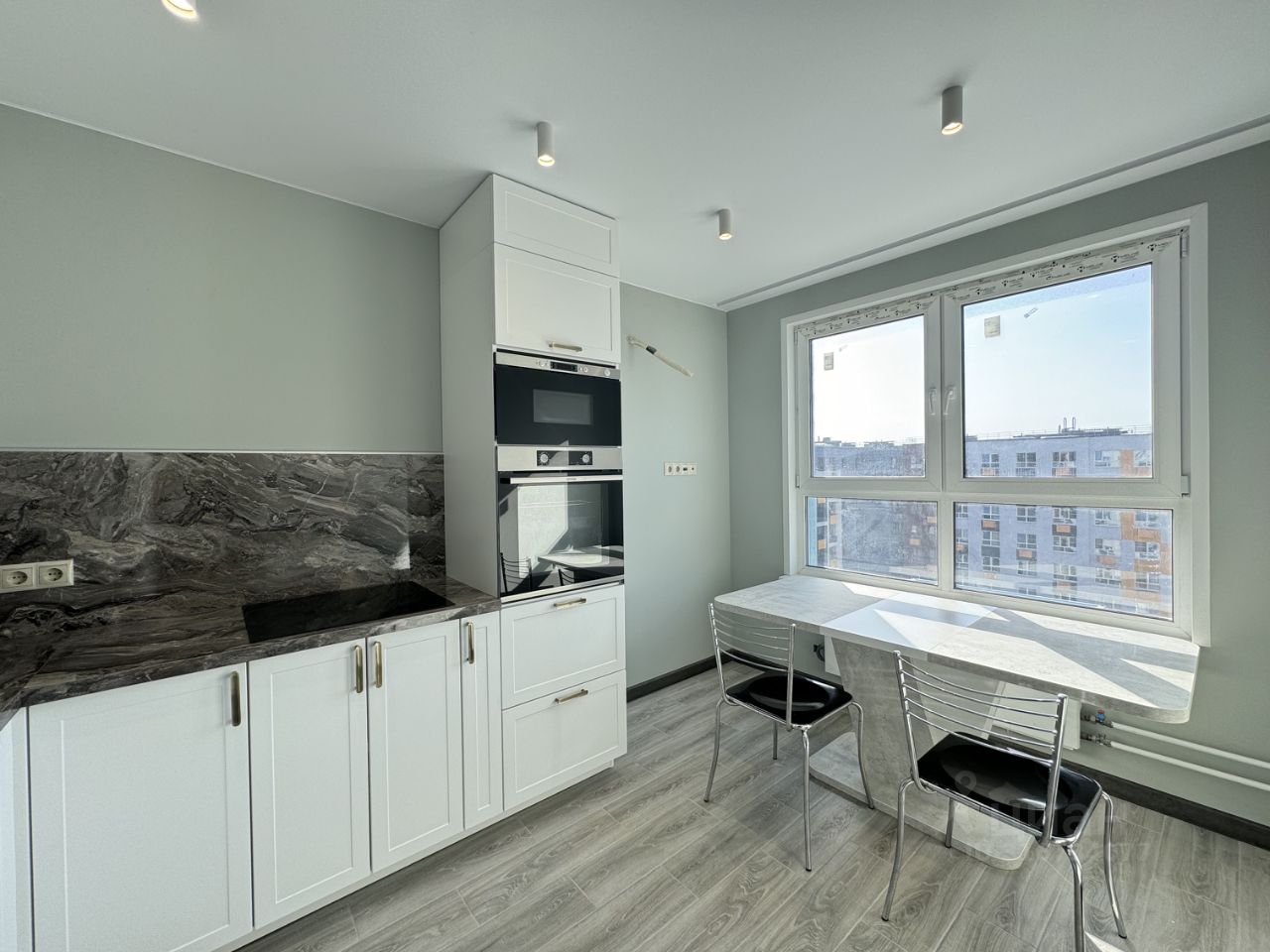 Новая кухонная мебель, установлена плита, духовой шкаф, свч, холодильник, есть все необходимые выводы под ТВ зону и проложена трасса под кондиционер. У окна большой стол и стулья.